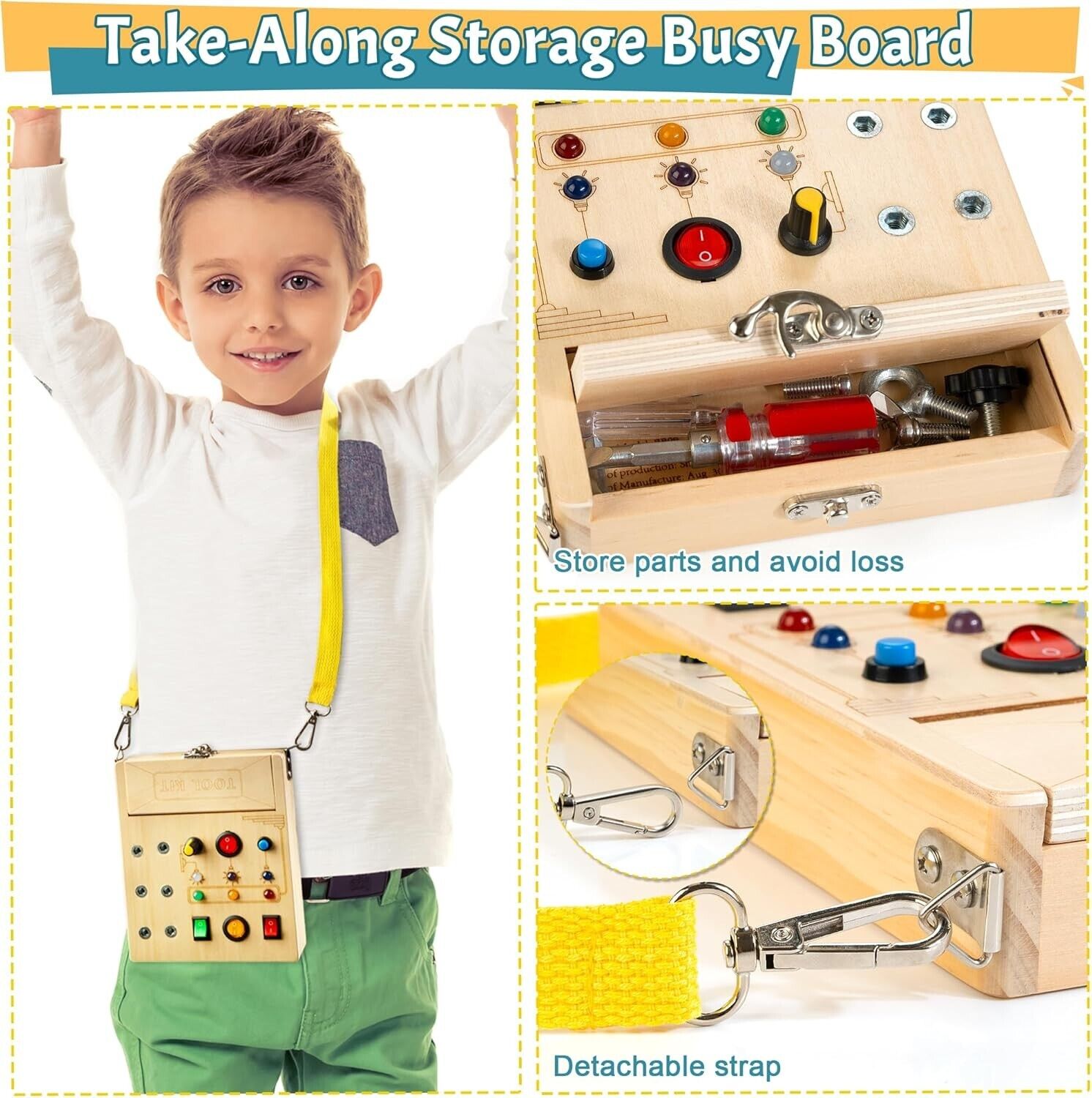 • 【2-in-1-Holz-Besy Board】 Unser beschäftigtes Board hat 2 Aktivitätsbereiche: Eine ist eine LED-Lichttafel mit 6 Schaltern, die 6 LED-Glühbirnen verbinden, das andere ist ein Schraubendreher-Betriebsbrett mit 6 echten Schrauben und 2 Werkzeugen zum Schrauben, kaufen Sie eine und genießen Sie 2 Freuden. Benötigt 2 AAA-Batterien (nicht im Lieferumfang enthalten)