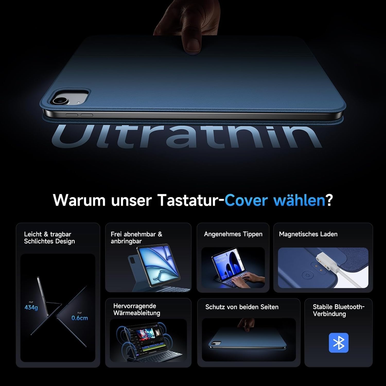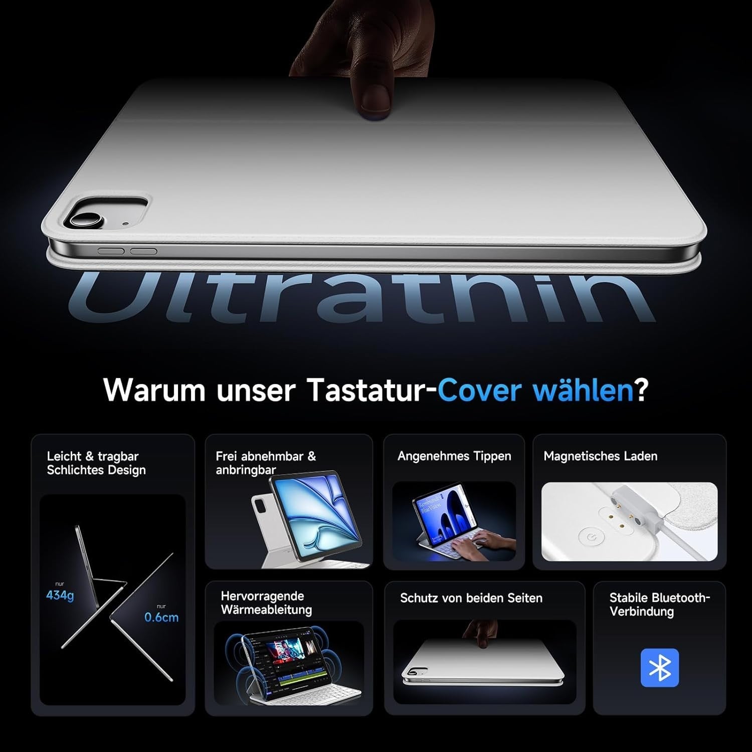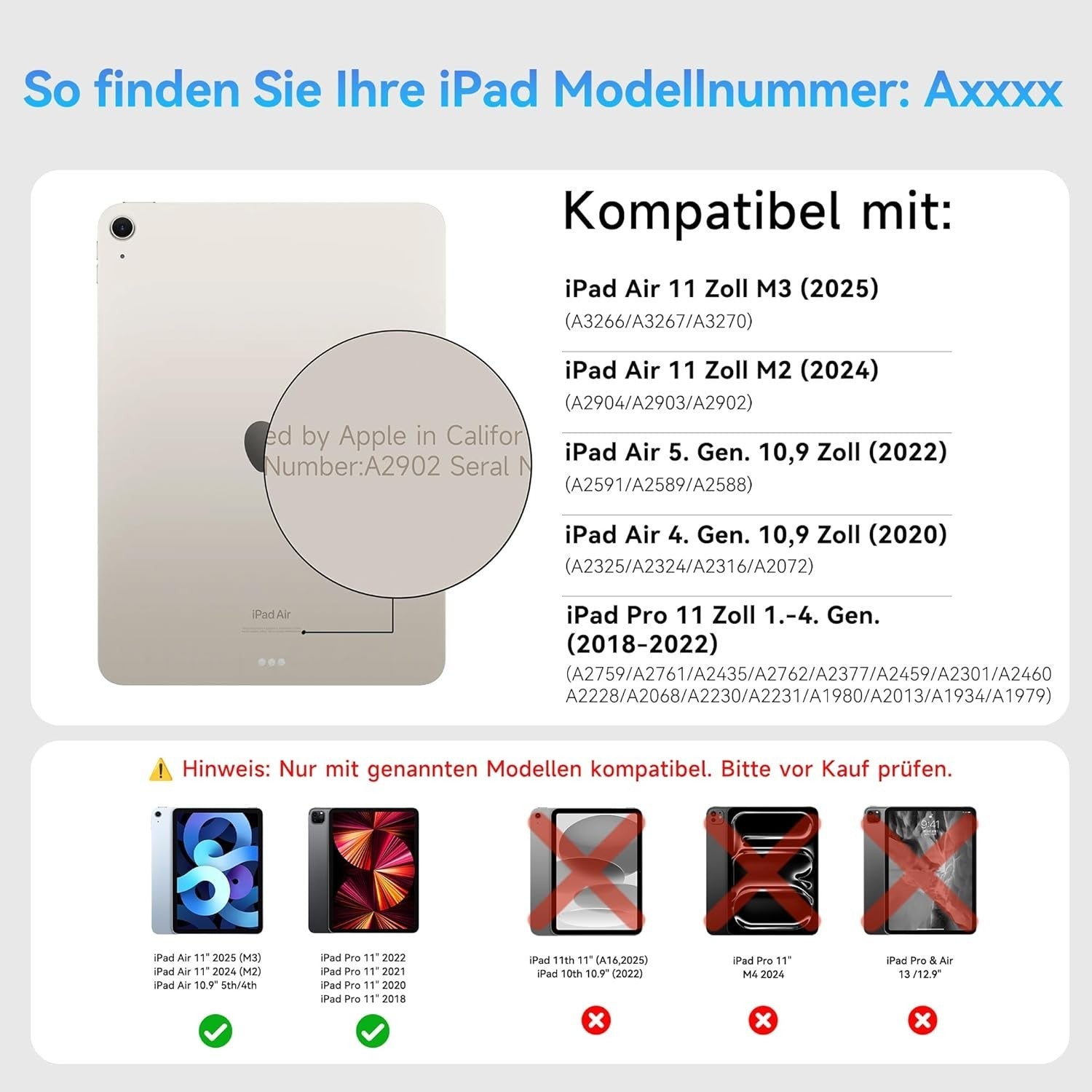 • 【Kompatibilität】 Bevor Sie einen Kauf tätigen, überprüfen Sie bitte die iPad-Modellnummer in [Einstellungen > Allgemein > Über] und verweisen Sie auf die Kompatibilitätstabelle. Es ist nur mit dem iPad Air 10,9 Zoll (5. / 4. Generation, 2022/2018), dem iPad Pro 11 Zoll (4. / 3. / 2. / 1. Generation, 2018 - 2022) und dem iPad Air 11 Zoll (M2/M3, 2024/2025) kompatibel.