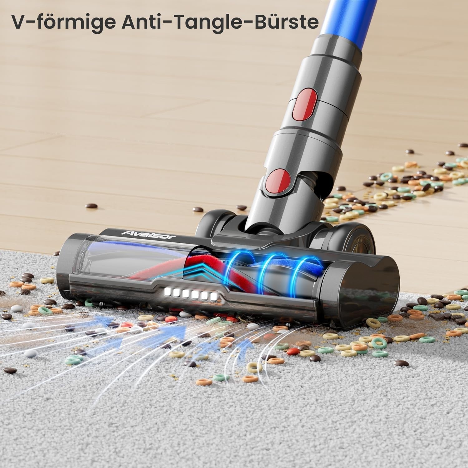 - 【Flexible Anti-Tangle-Bürste】 Durch das Rillendesign auf beiden Seiten der Bodenbürste können Sie sich problemlos von Staub verabschieden, der an den Kanten zurückbleibt. Um Haarverfilzungen wirksam zu reduzieren, haben wir uns für eine elektrische Bodenbürste 5C mit Kammstruktur und eine rotierende V-förmige Bürste mit einer Kombination aus weichen und harten Borsten entschieden. Der flexible Bürstenkopf mit LED-Licht erreicht problemlos dunkle Bereiche wie unter dem Tisch, unter dem Bett, unter dem Sofa usw.