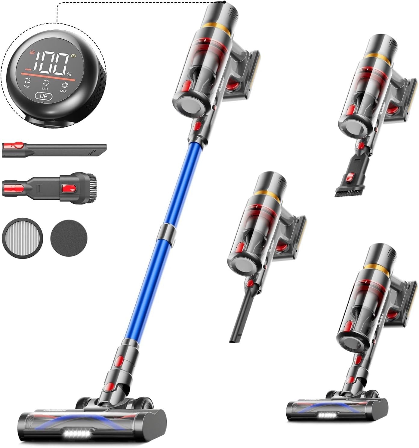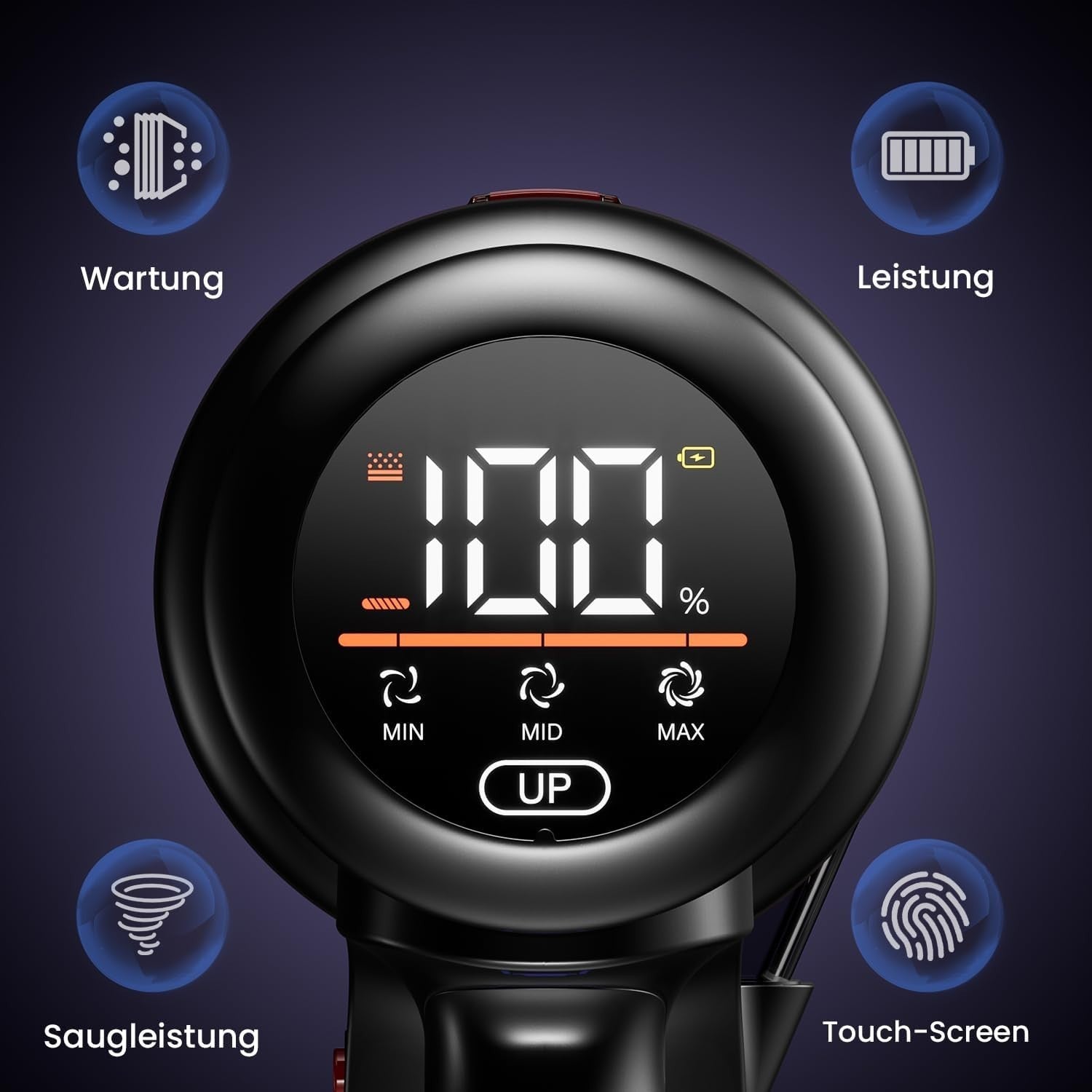 - 【HD-Farb-LED-Touchscreen】 Mit dem empfindlichen Sensorsystem können Sie den Arbeitsmodus mit einem Klick wechseln, den Betriebsstatus und die verbleibende Leistung des Akku Staubsaugers Kabellos in Echtzeit überwachen, Reinigungszeit und regelmäßige Wartung effektiv planen und alles unter Kontrolle behalten. Darüber hinaus ist das Design der vergrößerten Symbole benutzerfreundlicher, sodass kurzsichtige Menschen sowie Menschen mittleren Alters und ältere Menschen problemlos in den Genuss intelligenter Reinigung kommen können.
