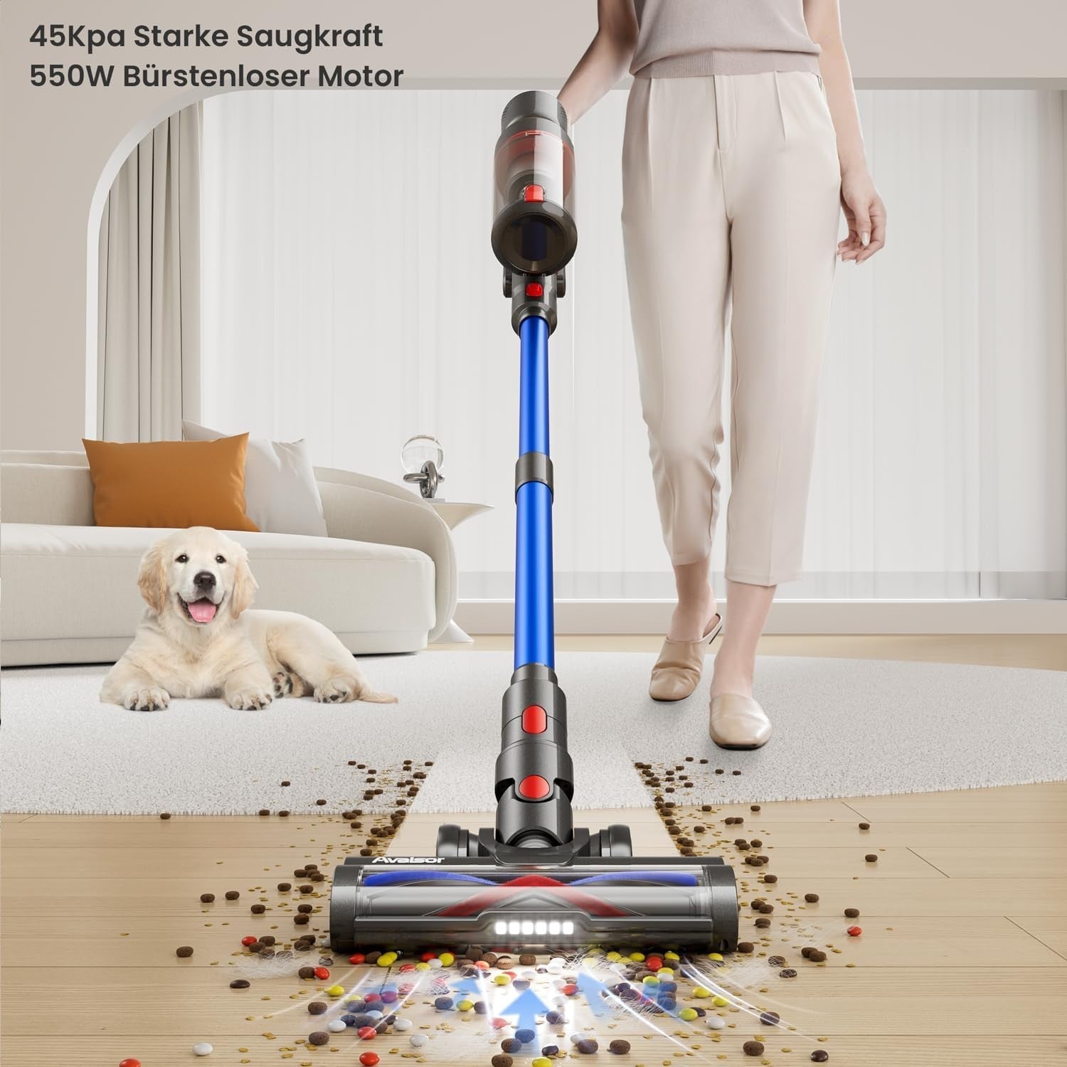 - 【550W&45000PA Super-Saugleistung】 Dank des marktführenden bürstenlosen 550-W-Motors zeigt uns der Akku Staubsauger eine erstaunliche Saugleistung von 45Kpa, bei einer Geschwindigkeit von bis zu 180.000 U/min. Das bedeutet, dass Sie Staub, Tierhaare und Schmutz auf Ihren Böden, Teppichen und Fliesen problemlos in einer ruhigen Umgebung (Lärm <62 dB) verabschieden können. Die Reinigung wird einfach und effizient.