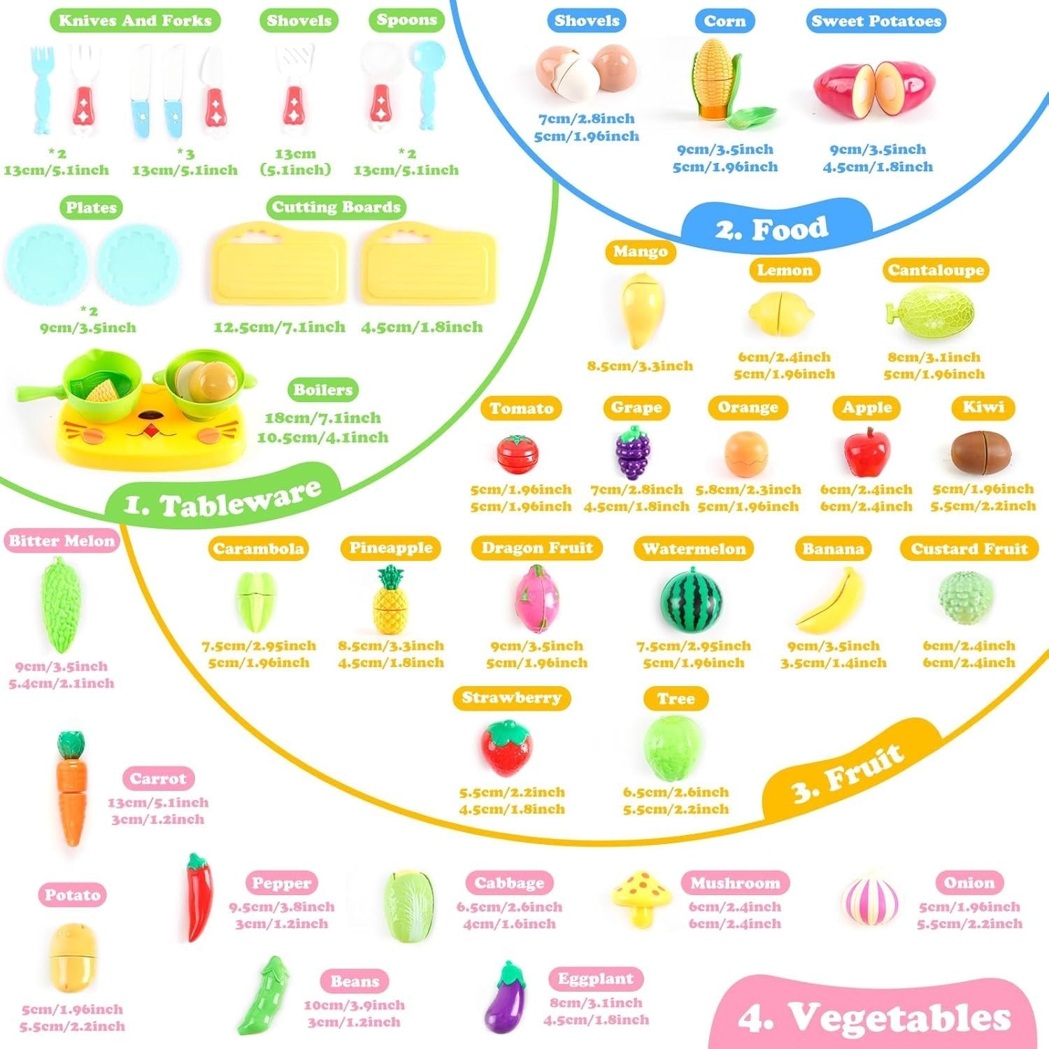 - Kinderküchenzubehör: Ein reichhaltiges Kinderküchenzubehörspielzeug umfasst 44 Zubehörteile, darunter 15 Obstsorten, 12 Gemüsesorten, 2 Kunststoffteller, 4 Topfspiele, 8 Geschirrteile, 2 Schneidebretter und 1 Aufbewahrungskorb. Viel Spaß mit dem Küchenspielzeug mit Ihren Kindern!