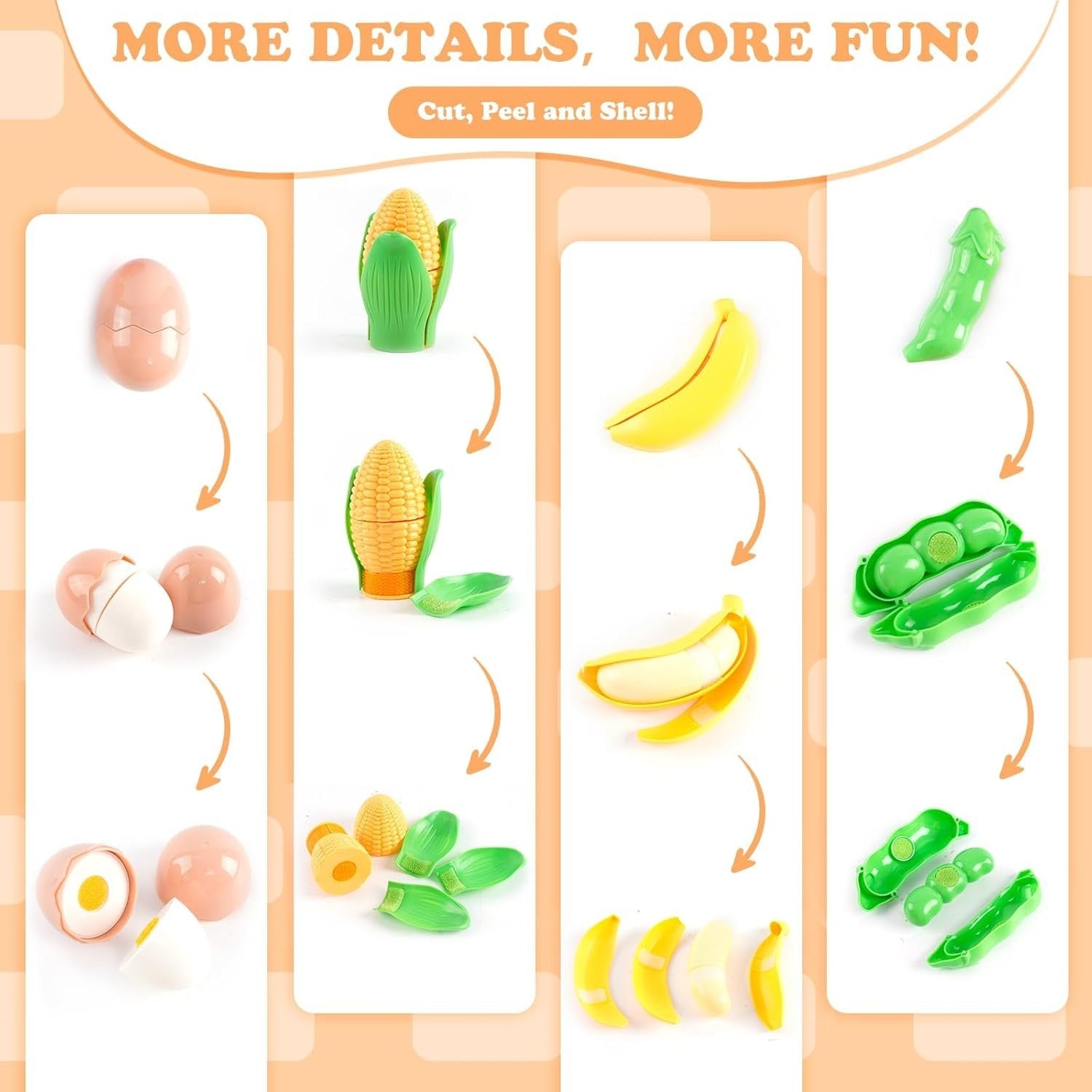 - Realistisches Design: Unser Gemüse und Obst ist mit einem Klettverschluss versehen, der das Schneiden und Schälen erleichtert. Beim Schneiden entsteht ein realistisches Schneidegeräusch. Maisblätter, Kohl und Bananenschalen lassen sich schälen. Eiweiß und Eierschalen, Orangenfleisch und Orangenschale lassen sich trennen.