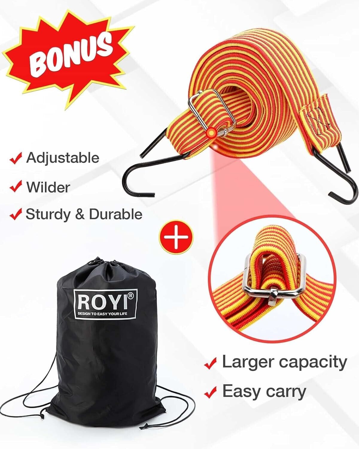 • 1 FLACHE ELASTISCHE SEILE ENTHALTEN - elastische Schnur mit Ultra Haken Maßnahmen 199x 2,5 cm. 3X stärker als ein herkömmlicher Haken. Das flach Band Design verteilt die Last und schneidet die Ladung nicht ab.