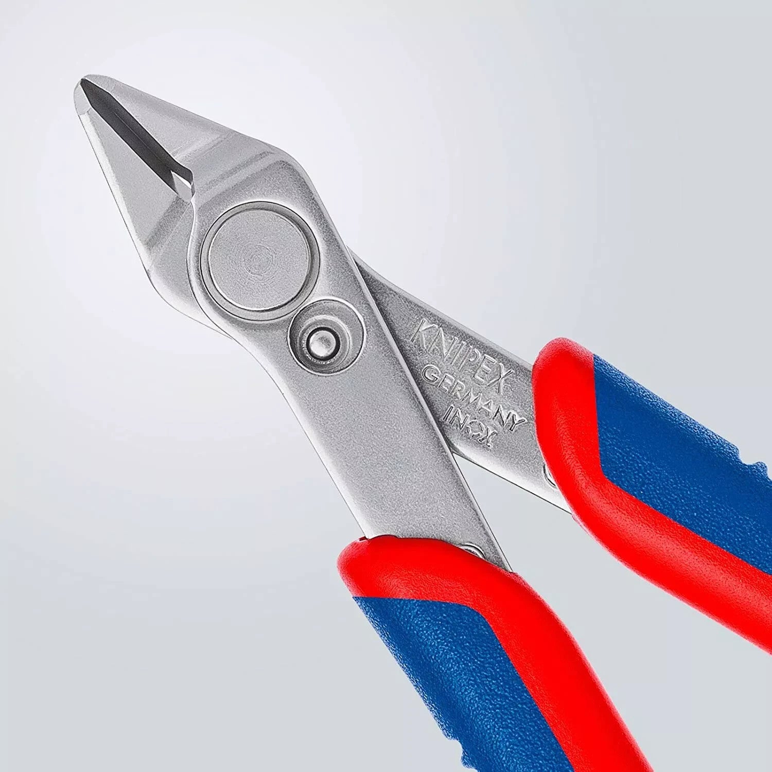 Die Knipex Electronic Super Knips wird aus Chirurgiestahl (INOX-Stahl) gefertigt. Für flächengleiches Trennen werden die Schneiden ohne Facette geschliffen und auf ca. 54 HRC gehärtet.