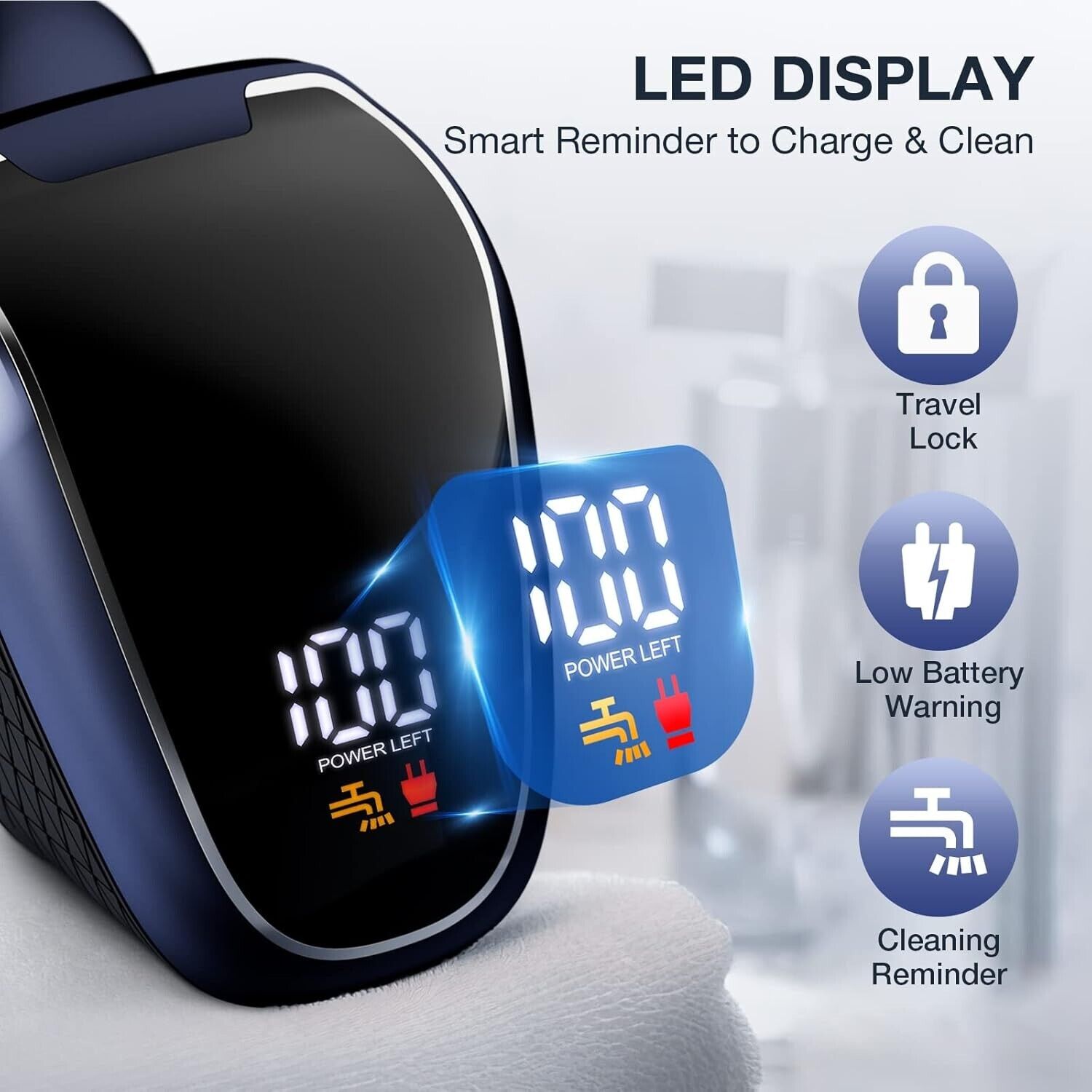- Intelligente LED-Anzeige: Der Glatzkopfrasierer für Männer mit LED-Anzeige kann den Prozentsatz der Akkuleistung genau anzeigen. Erinnerung bei niedrigem Batteriestand, Erinnerung an das Wasserwaschen intelligenter. Drücken Sie die Schaltertaste 3 Sekunden lang, um die Reisesperre auszulösen, um zusätzlichen Stromverbrauch zu vermeiden. Dieser elektrische Rasierer verwendet einen 600-mAh-Akku mit großer Kapazität, 2 Stunden schnelles Aufladen kann 60 Minuten Arbeitszeit bieten. Bitte laden Sie es rechtzeitig für den regelmäßigen Gebrauch auf.