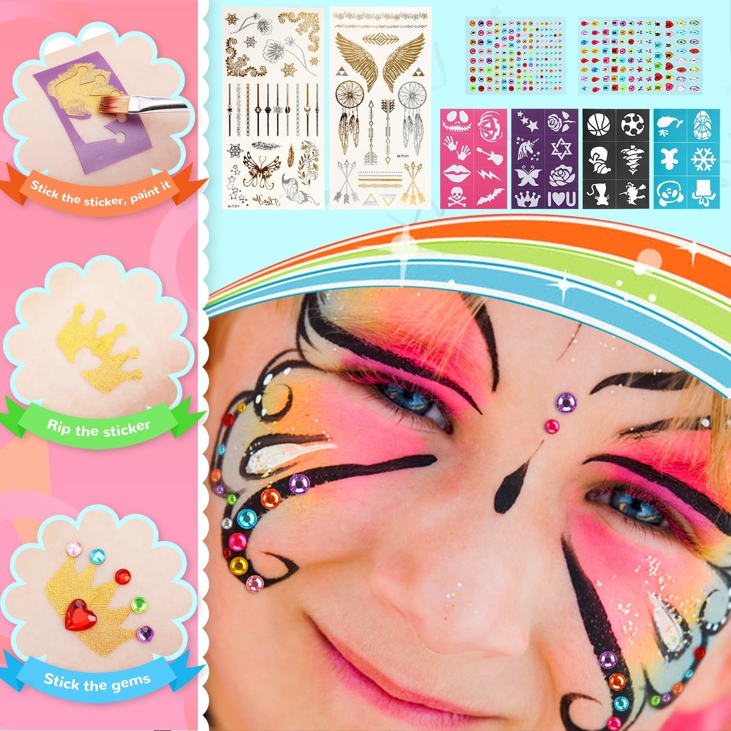 - 16 Schablonen & 2 Blatt Strasssticker - Schablonen lassen sich leicht aufkleben und abziehen und sind auch wiederverwendbar. Nicht nur zum Bemalen von Gesichtern, sondern auch zum Erstellen von Tattoos mit Glitzer auf anderen Körperteilen wie Händen, Armen oder Beinen. Diese Strasssticker in verschiedenen Farben, die glitzern und leuchten, sind in verschiedenen Größen und Formen erhältlich, z.B. herzförmig, rund, quadratisch, rechteckig, Wassertropfen usw. Dies deckt Ihren DIY-Handwerksbedarf.