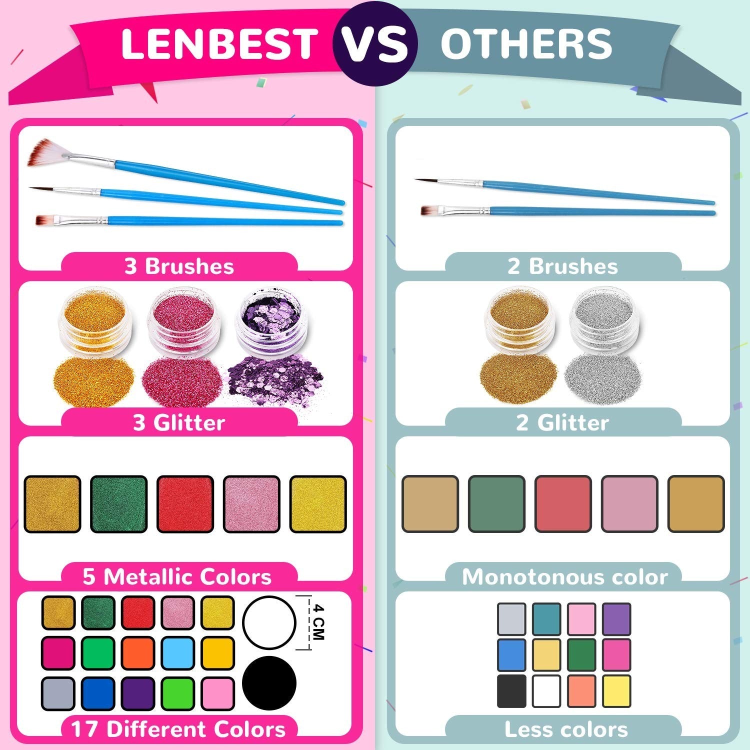 - 17 Farben + 3 Pinsel - 17 verschiedene Farben Gesichtsfarbe umfasst 12 lebendige Farben und 5 Metallic-Farben. Unsere Metallic-Farbe ist unübertroffen, sodass Sie schimmernde Perlglanz-Spezialeffekte erzielen und auf Ihrem Gesicht funkeln können. Es lässt sich Bilder bei hellem Licht aufnehmen, so dass sie die maximale Wirkung erzielen! 3 Verschiedene Formen und Größen der Borsten, um Ihre Make-up-Bedürfnisse für die Anwendung und ideal für Make-up-Anfänger zu erfüllen.