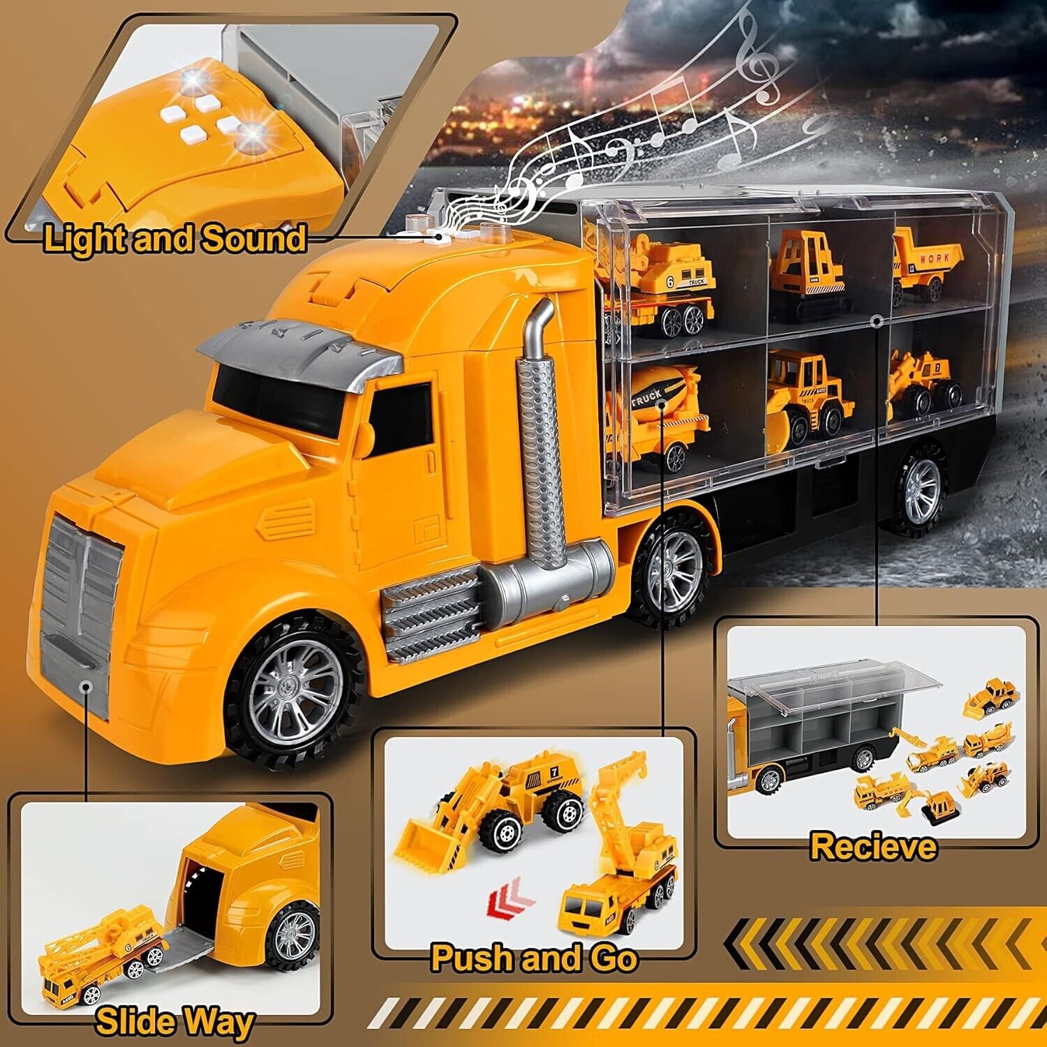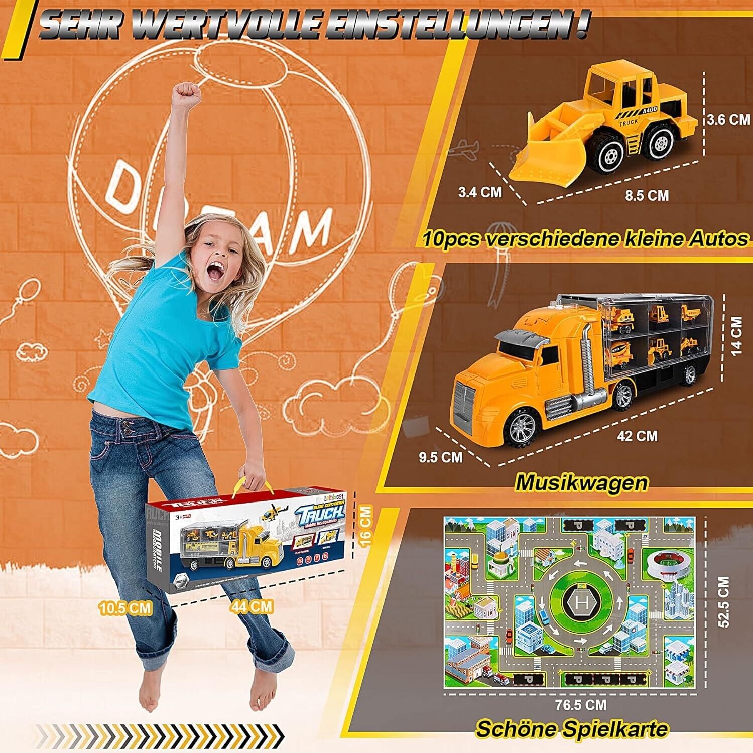 - 【Multifunktions-LKW】- Der LKW hat 3 Funktionen: Musiktaste, Gleitschiene und Ablage. Es gibt 4 Musiktasten auf dem Kopf. Drücken Sie sie und Sie erhalten Arten von Soundeffekten und Songs, die stark den Spaß erhöhen und profitieren Kinder Musik Aufklärung und Tanz Zellkultur. Öffnen Sie die Autoabdeckung, erhalten Sie eine Rutsche für einen kleinen Bauwagen. Inzwischen kann die hintere Hälfte des großen LKW jedes kleine Auto unterbringen, die Verbesserung der chaotischen Spielzeug Platzierung!
