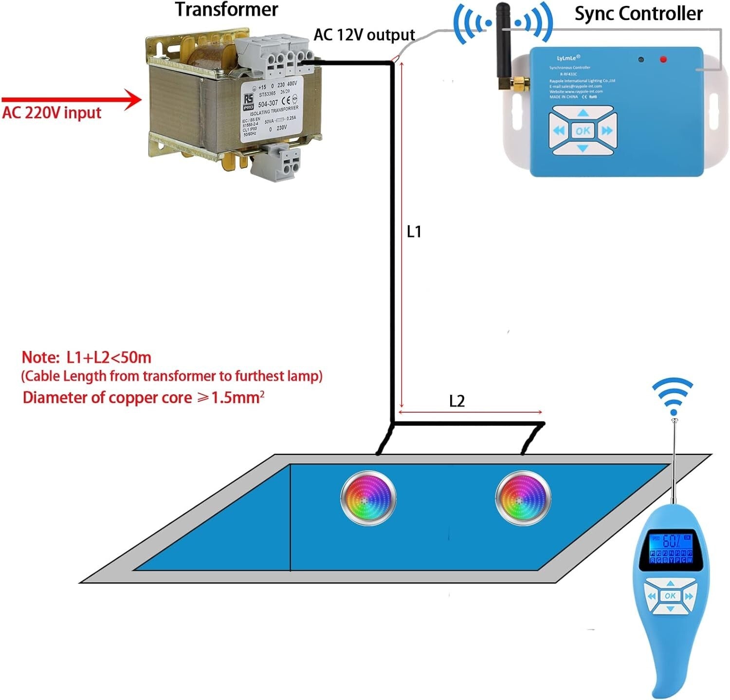 • Synchrone Serienleuchten - Diese RGB poolbeleuchtung unterscheidet sich von der RF-Steuerung Lampe. Das Signal wird über die Stromkabel der Lampen übertragen und wird nicht durch das Poolwasser beeinträchtigt, der Steuerabstand kann bis zu 60m betragen, um eine perfekte Synchronisation und Steuerung aller Lampen zu erreichen.