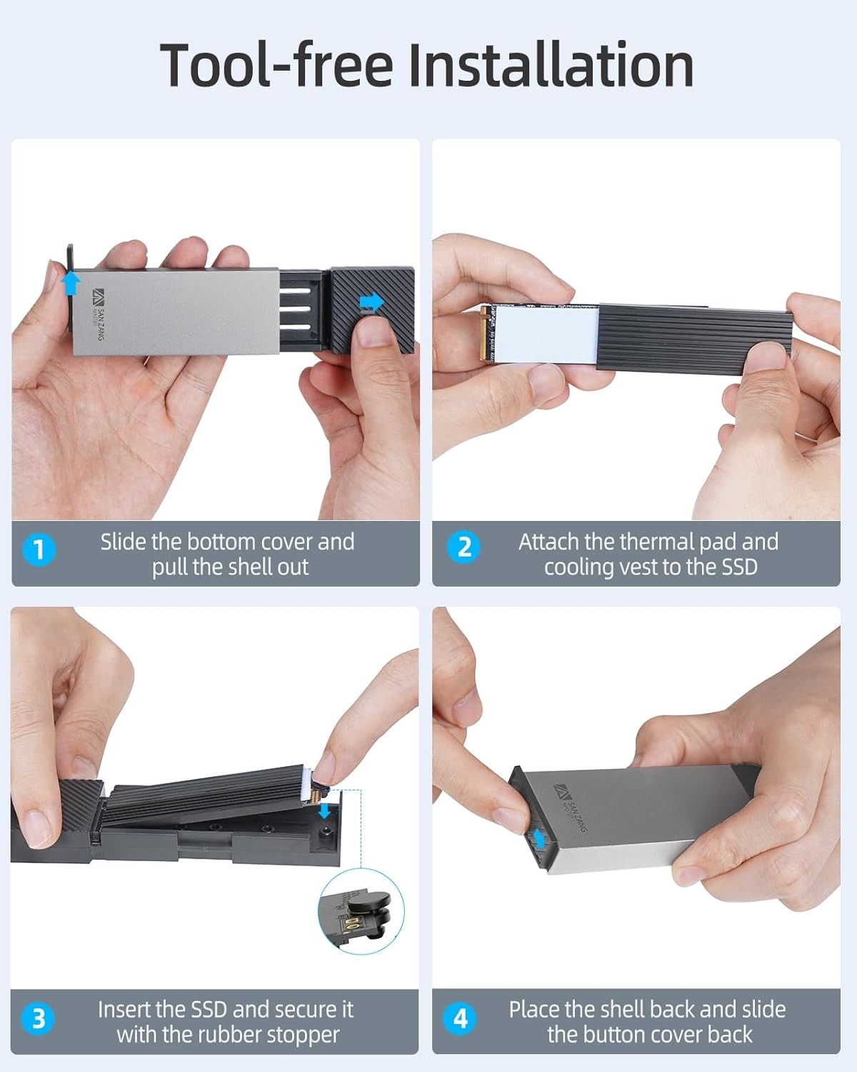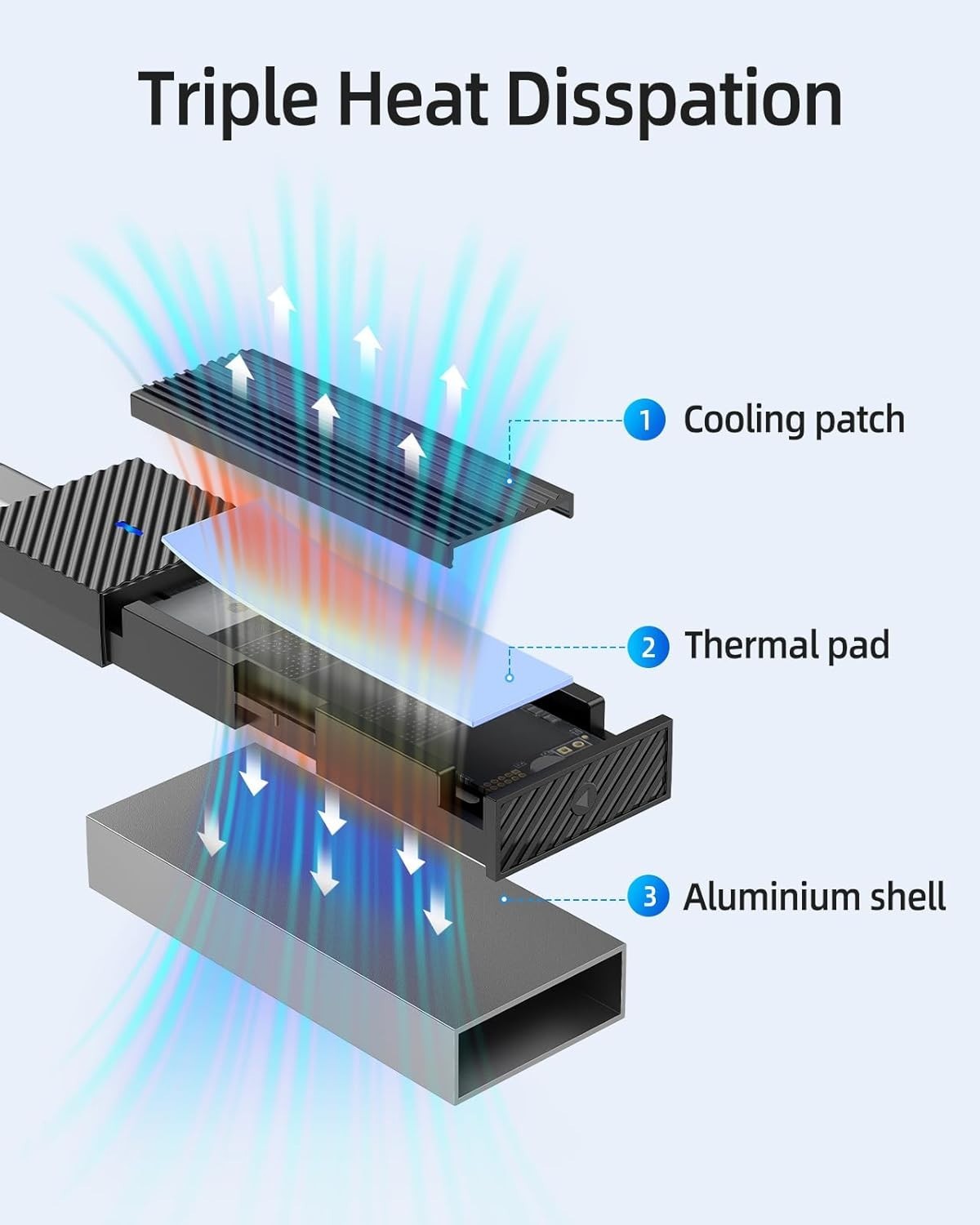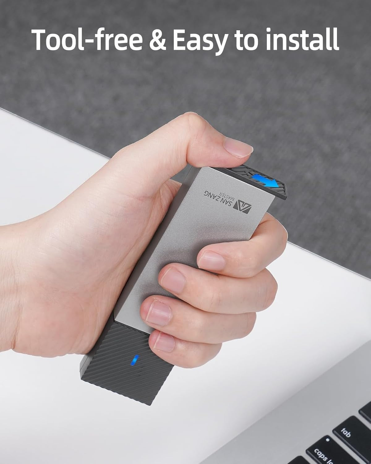- 【Dreifache Wärmeableitung】 Das SANZANG-Gehäuse verfügt über ein leistungsstarkes dreifaches Wärmeableitungssystem, das ein Gehäuse aus Aluminiumlegierung, ein wärmeleitendes Pad und eine Kühlweste kombiniert. Dieses innovative Design verhindert wirksam Überhitzung und Drosselung, was zu einer verbesserten SSD-Leistung, einer längeren SSD-Lebensdauer und einem geringeren Stromverbrauch führt.