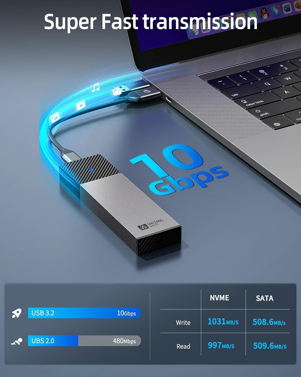 - 【Blitzschnelle 10-Gbit/s-Übertragung】 Erleben Sie blitzschnelle Datenübertragungen mit dem SANZANG NVMe/SATA M.2-Gehäuse, erreichen Sie atemberaubende Geschwindigkeiten von 10 Gbit/s und übertragen Sie einen HD-Film in Sekundenschnelle. UASP/Trim-Unterstützung, abwärtskompatibel mit USB 3.0/2.0. Hervorragende Wärmeableitung für stabile und schnelle Übertragung.