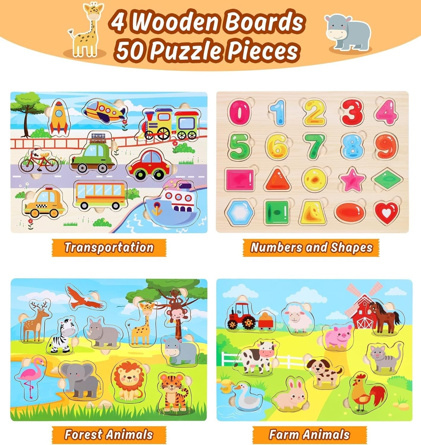 - 5 thematische Holzpuzzles: Dieses Puzzle besteht aus insgesamt 4 Holzbrettern und 50 Puzzleteilen. Das Puzzle enthält 5 Themen: Nutztiere, Waldtiere, Zahlen, Formen und Transport. Mit diesen Holzpuzzles lernen Kleinkinder verschiedene Objekte kennen, und die reichhaltigen Muster und leuchtenden Farben ziehen die Aufmerksamkeit der Kinder auf sich.