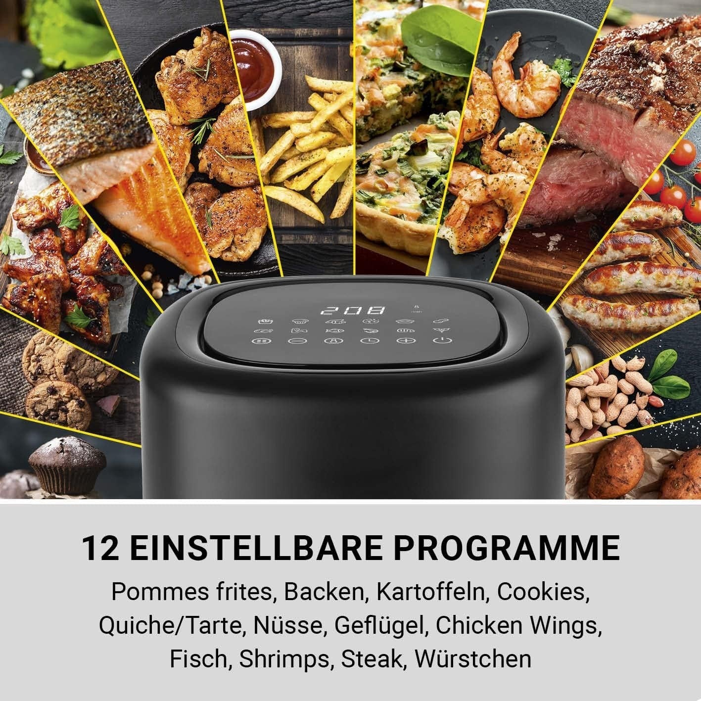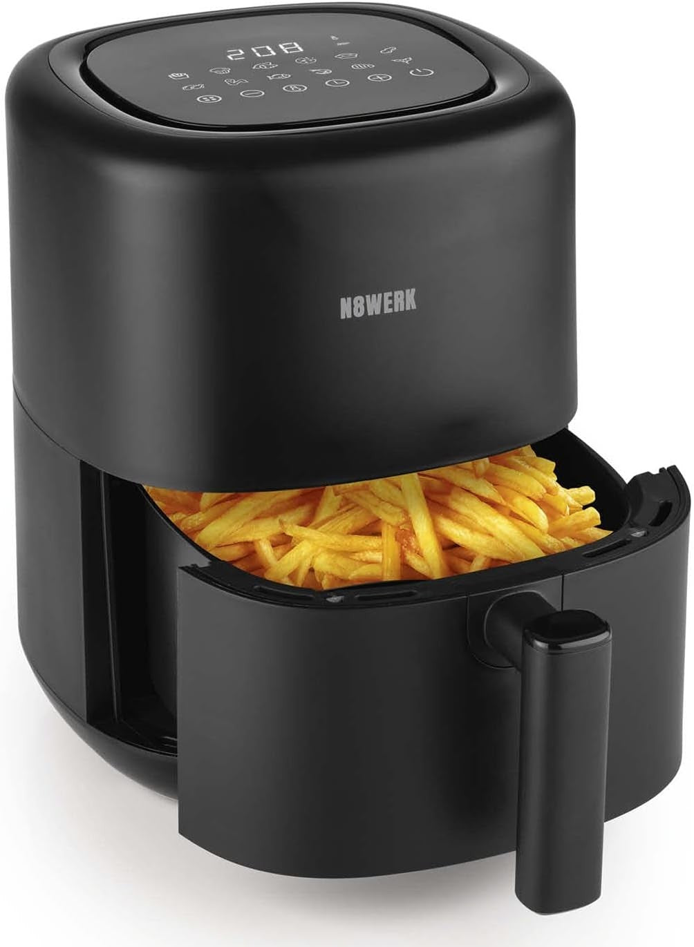 N8WERK Heißluft-Fritteuse | Ideale Größe für 1-2 Personen | Kapazität: 3 Liter | Kompakt und Leistungsstark | Mit 12 Kochprogrammen | Schnelles und Fettarmes Garen durch 360° Heißluft-Zirkulation