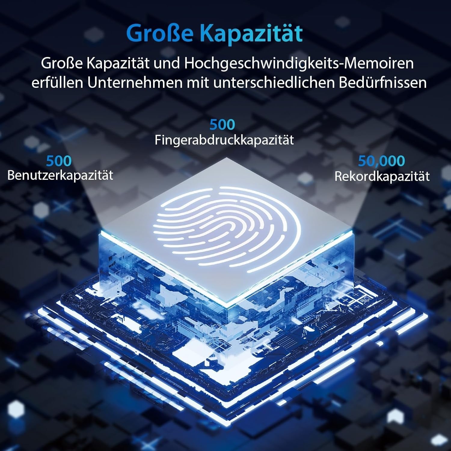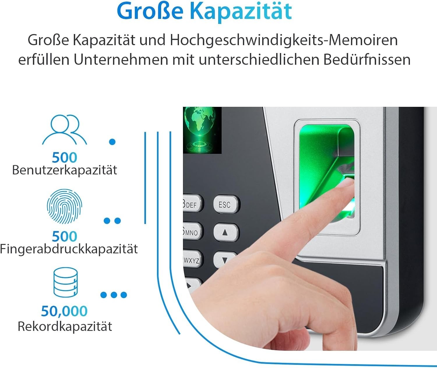 - 【Daten Können Lange Gespeichert Werden】500 Benutzer, 500 Fingerabdrücke können gespeichert werden, und der Datensatz kann bis zu 50.000 Mal gespeichert werden, was den Anforderungen der gesetzlichen Vorschriften entspricht.