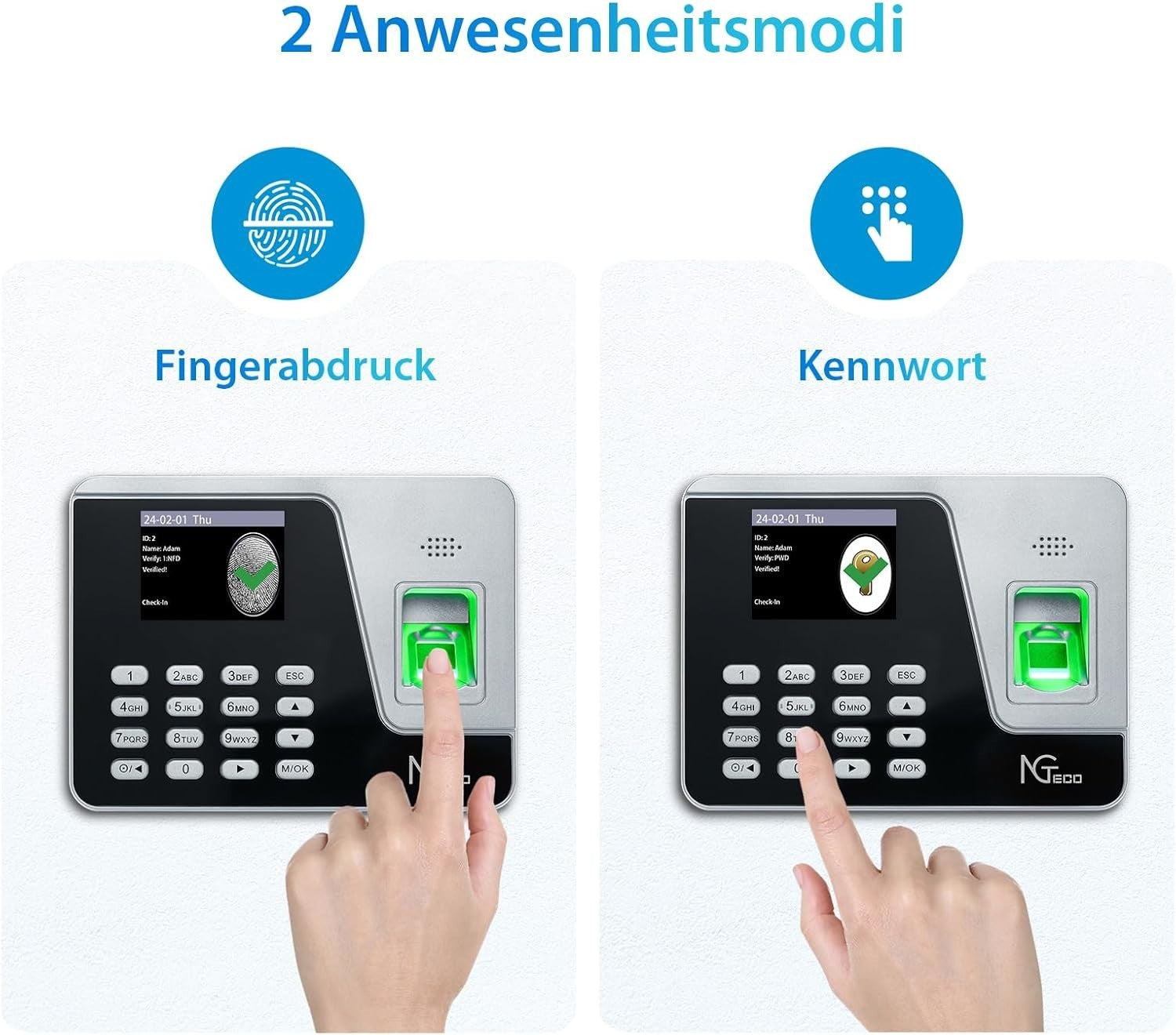 - 【Kein Netzwerk Erforderlich】Die Zeiterfassungsmaschine AS10 muss nicht an das Netzwerk angeschlossen werden, Sobald Mitarbeiterinformationen und Anwesenheitsmethoden eingerichtet sind, können sie verwendet werden, durch den kostenlosen USB-Stick können Daten importiert und exportiert werden, das Berichtsformat ist EXCEL.