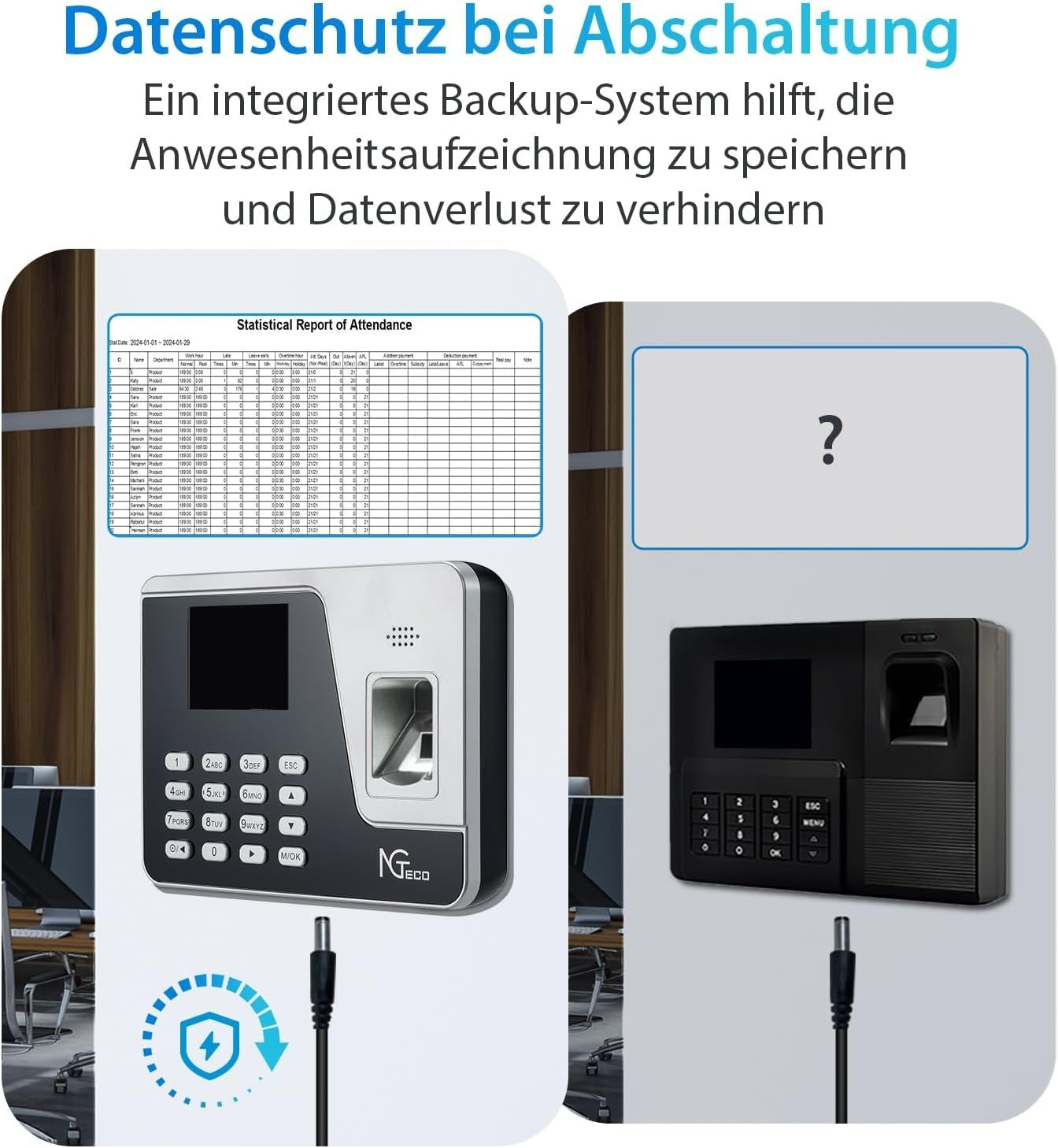 - 【Stromausfalldatenschutz】Die eingebaute Backup-Funktion schützt die Zeitdaten (einschließlich Stempelzeitbericht und Mitarbeiterdetails) im Falle eines Stromausfalls. Sie müssen die Zeiterfassung nicht zurücksetzen und müssen sich nie wieder Sorgen über Datenverlust machen.
