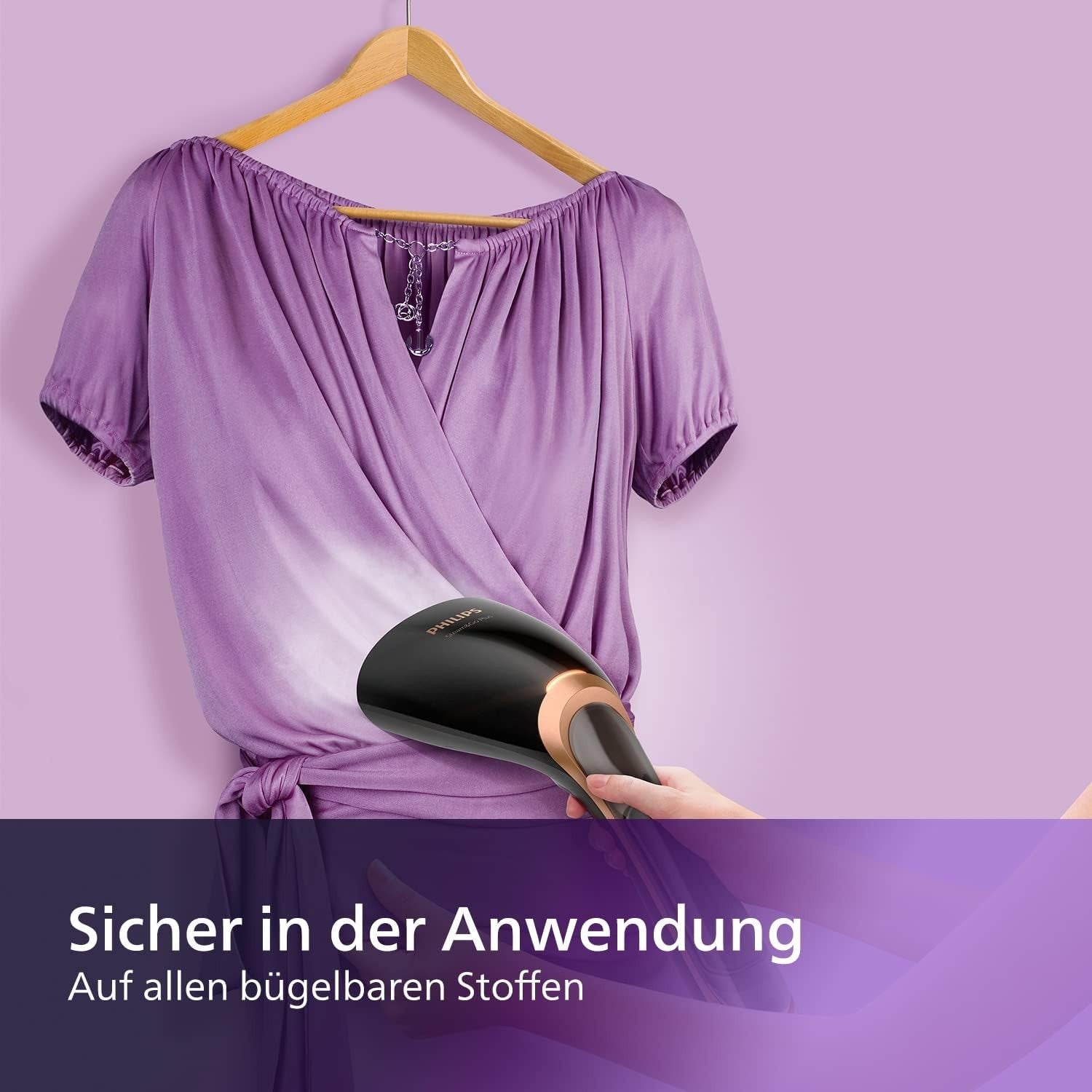 - Vertikaldampf für hängende Kleidungsstücke: Mit der Vertikaldampffunktion können Sie Kleidungsstücke direkt am Kleiderbügel auffrischen und auch Falten aus Vorhängen entfernen – ganz ohne Bügelbrett