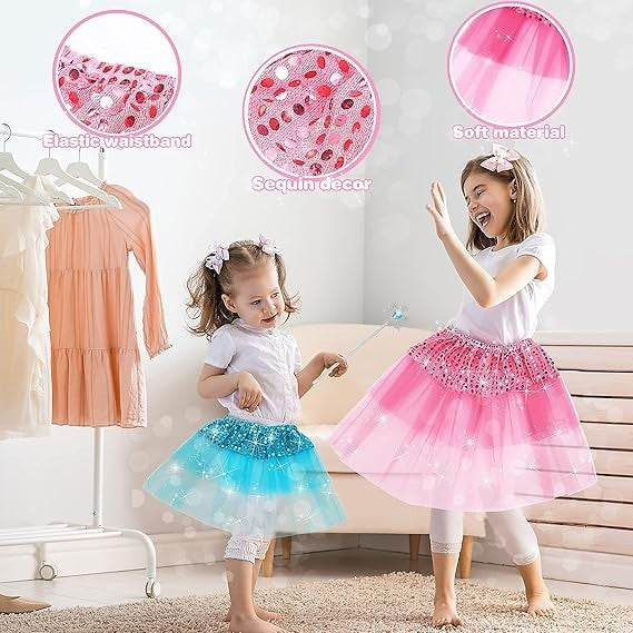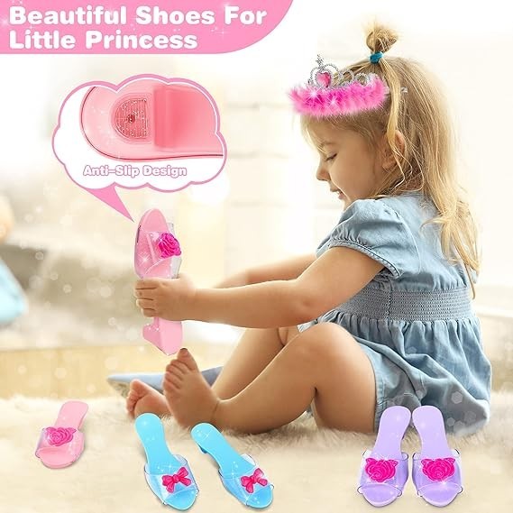 • 【Prinzessin Glänzend Schmuck】Jojoin prinzessin schuhe enthält 3 mehrfarbige prinzessin schuhe, 1 weiches Einhorn-Portemonnaie, 2 Röcke, 2 Prinzessinnen-Zauberstäbe, 2 Gesichts-Kristallaufkleber, 2 Kronen, 2 Paar Ohrringe, 2 Ringe, 2 Armbänder und 2 Halsketten. Mehr Zubehör bringt mehr Spaß für Ihre Kinder und ihre Freunde. Sich mit Freunden zu verkleiden fördert nicht nur die Fantasie und Kreativität der Kinder, sondern auch die sozialen Fähigkeiten der Kinder!