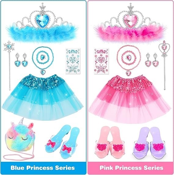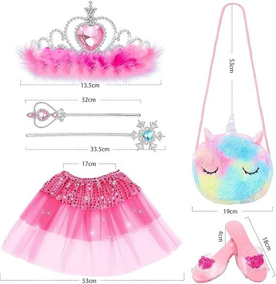 Jojoin Prinzessinnenschuhe für Mädchen, Prinzessinnen-Kostüm, Zubehör mit 3 Paar Schuhen, 1 Einhorn-Tasche, 2 Röcke, Prinzessinnenschmuck für Karneval, Einhorn Geldbörse für Geschenk 3 – 6 Jahre
