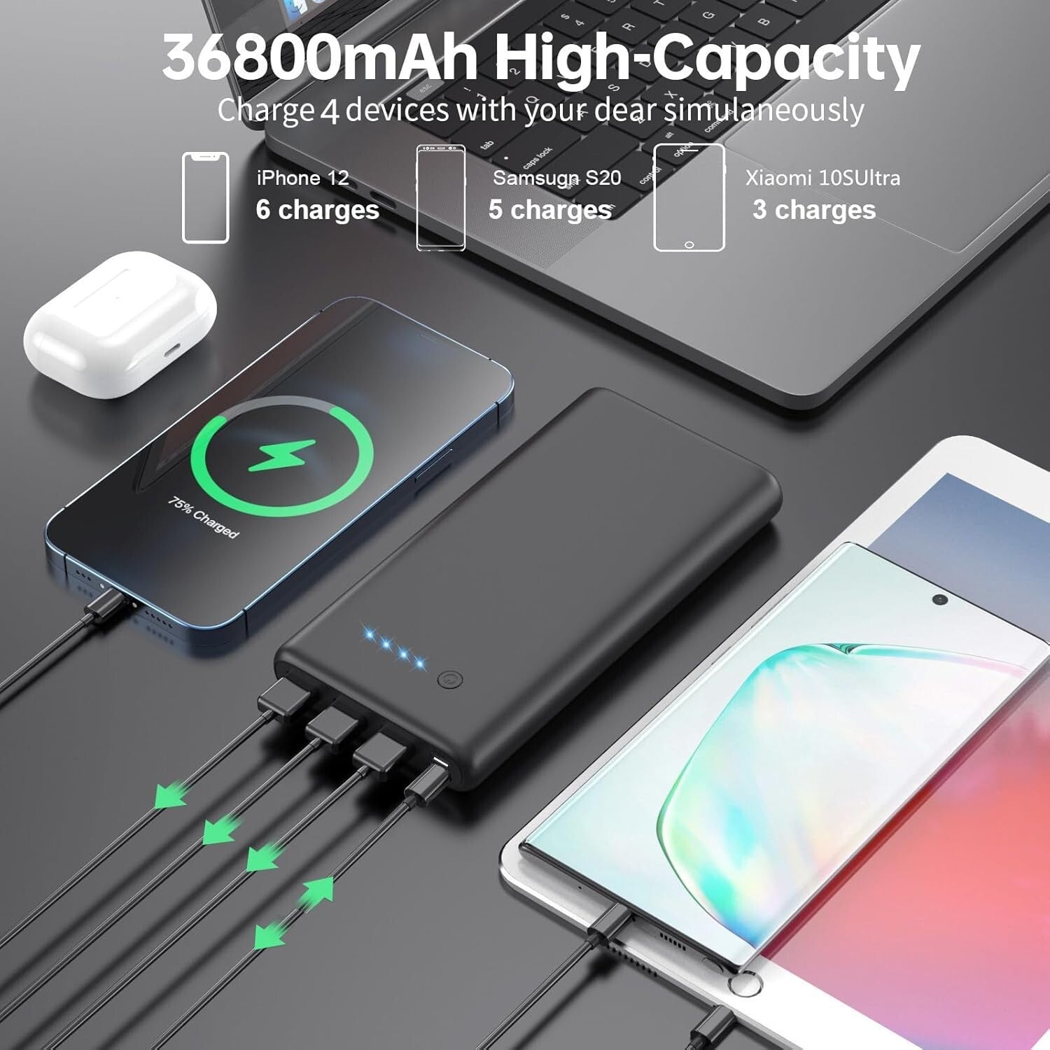 36800mAh Ultra-hohe Kapazität: [2023 Version] 36800mAh Powerbank mit ultra-hoher Kapazität kann für iphone 14/13 /12 über 6 mal, Samsung Galaxy S20 über 5 mal aufladen. Halten Sie Ihr Telefon läuft den ganzen Tag.