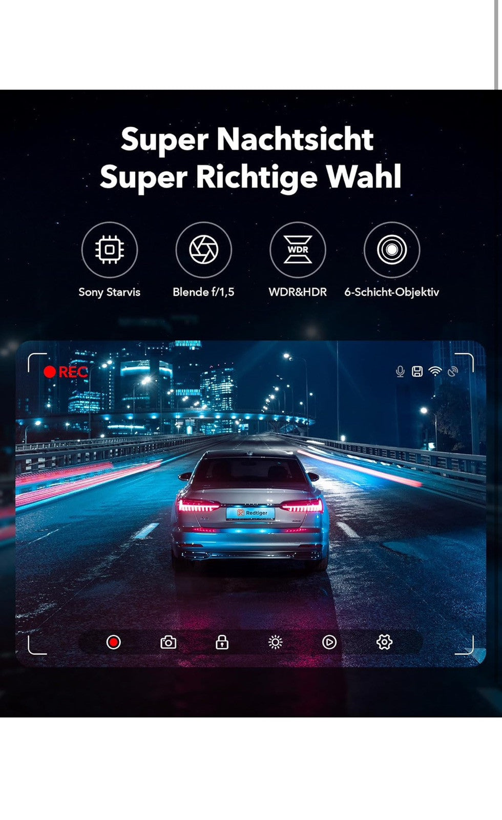 [Ultra Nachtsicht] - Die Dashcam ist mit einem leistungsstarken 6-Schicht-Objektiv mit F1.5-Blende und HDR / WDR-Technologie ausgestattet, das die hellen und dunklen Teile der Aufnahme in hellen oder dunklen Szenen ausbalanciert und nachts klare Bilder aufnimmt, um die Nachtfahrsicherheit zu verbessern.