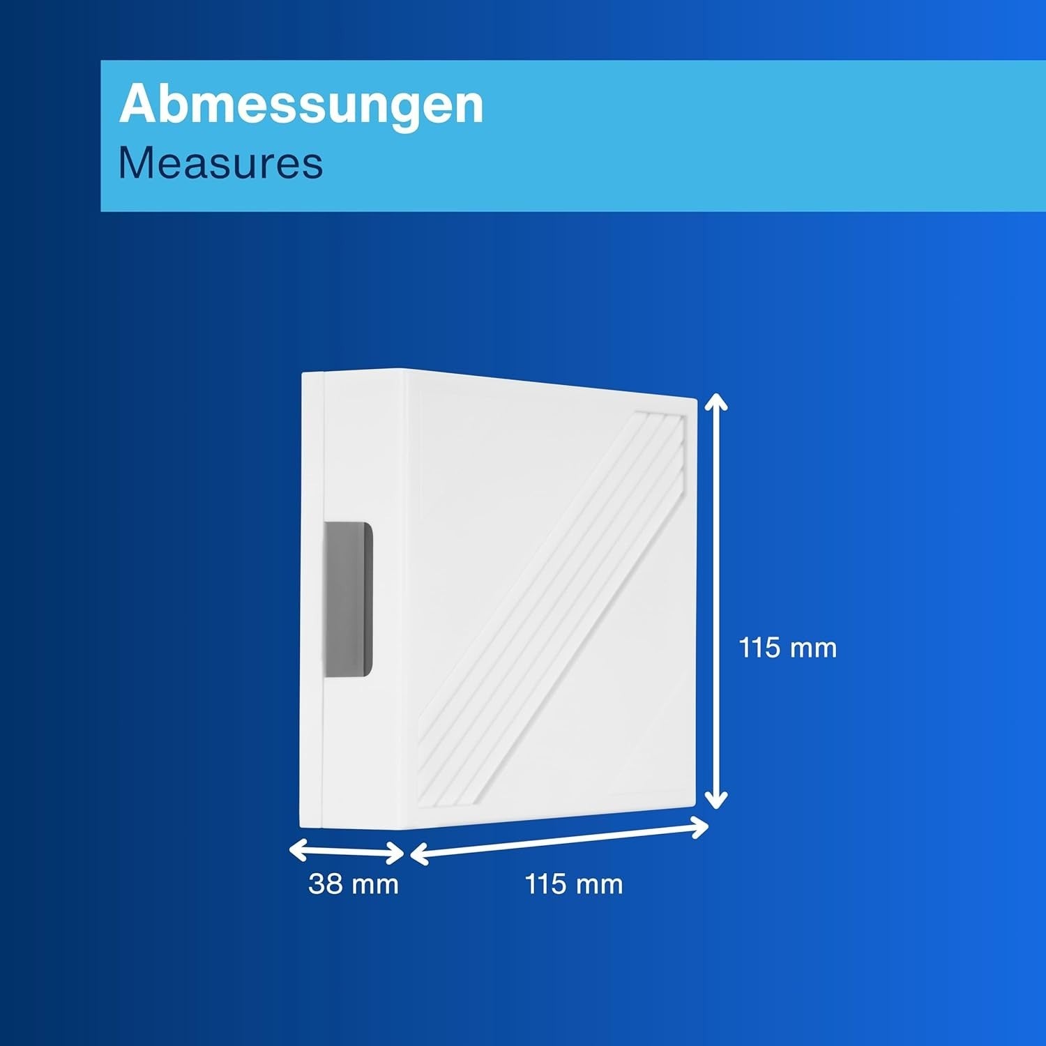 • Technische Details des Doppelklang Gongs: Betriebsspannung: 8V~, Stromaufnahme: 0,6A, Abmessungen (BxHxT): 115 x 38 x 115 mm, Gewicht: 218g. Farbe: weiss