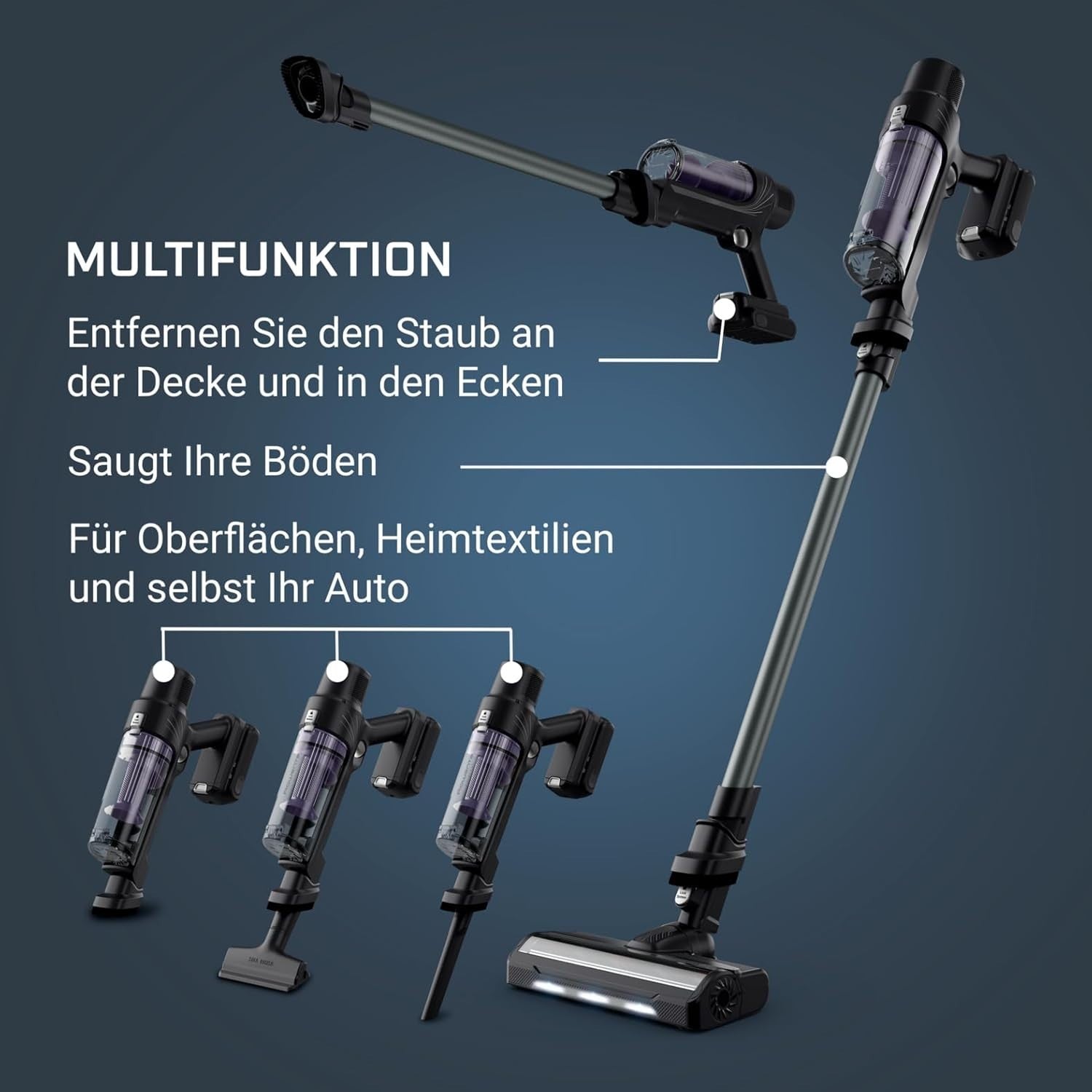 • VIELSEITIGKEIT: Verwenden Sie den Akku-Stabstaubsauger ganz einfach als Handstaubsauger und dank seines vielseitigen Zubehörs auch für Möbel und Fugen