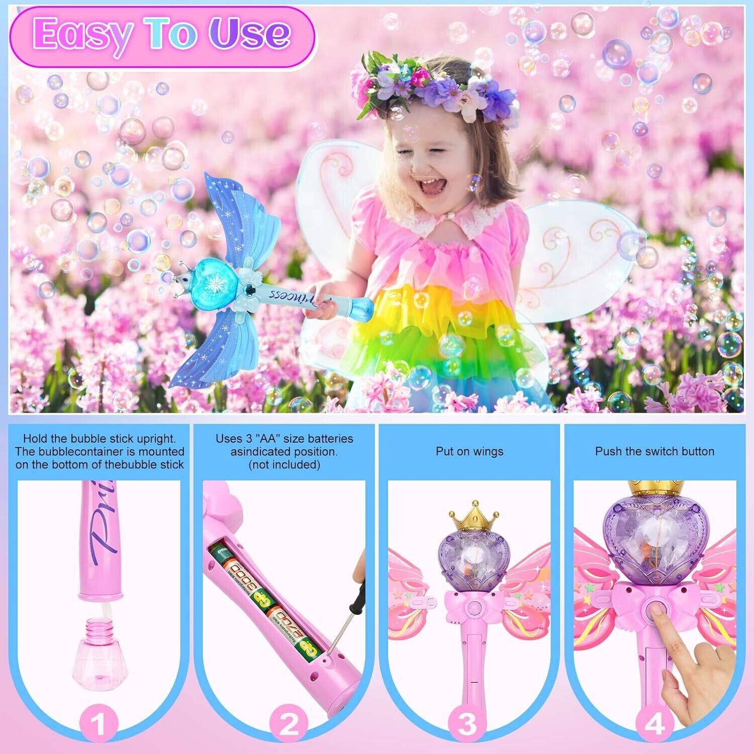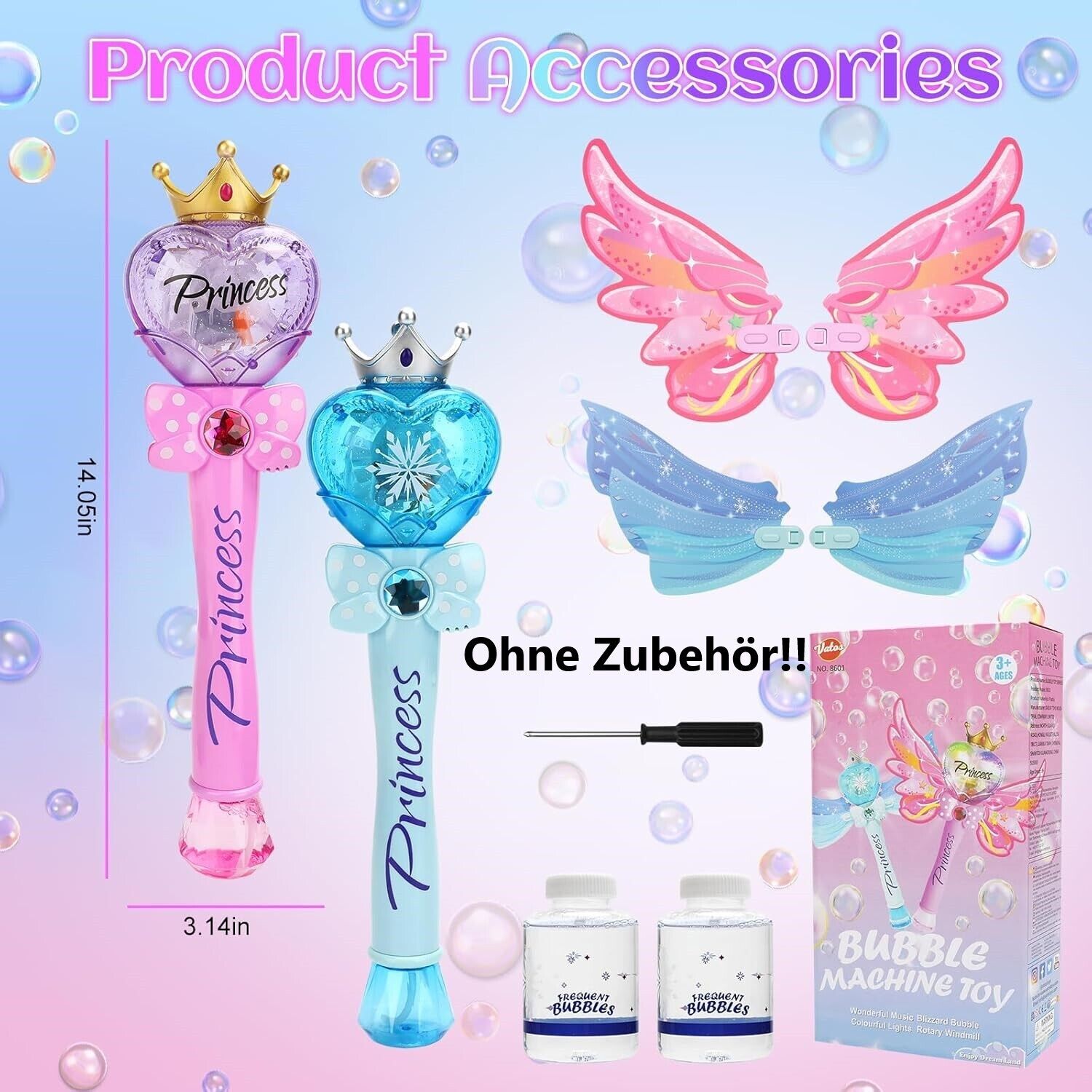 - Märchenprinzessin Traumland - Jedes Mädchen träumt von einer Prinzessin, und dieses Set aus rosa und blauen Seifenblasenstäben dekoriert Mädchen als wunderschöne Feen. Lassen Sie der Fantasie Ihres Kindes mit dem magischen Märchen freien Lauf. Der rosa und blaue Feenstab, die Krone, die abnehmbaren Flügel und die Fantasie-Seifenblase bilden ein wunderschönes und verträumtes Spielzeug, das Ihre Kinder wirklich genießen werden.