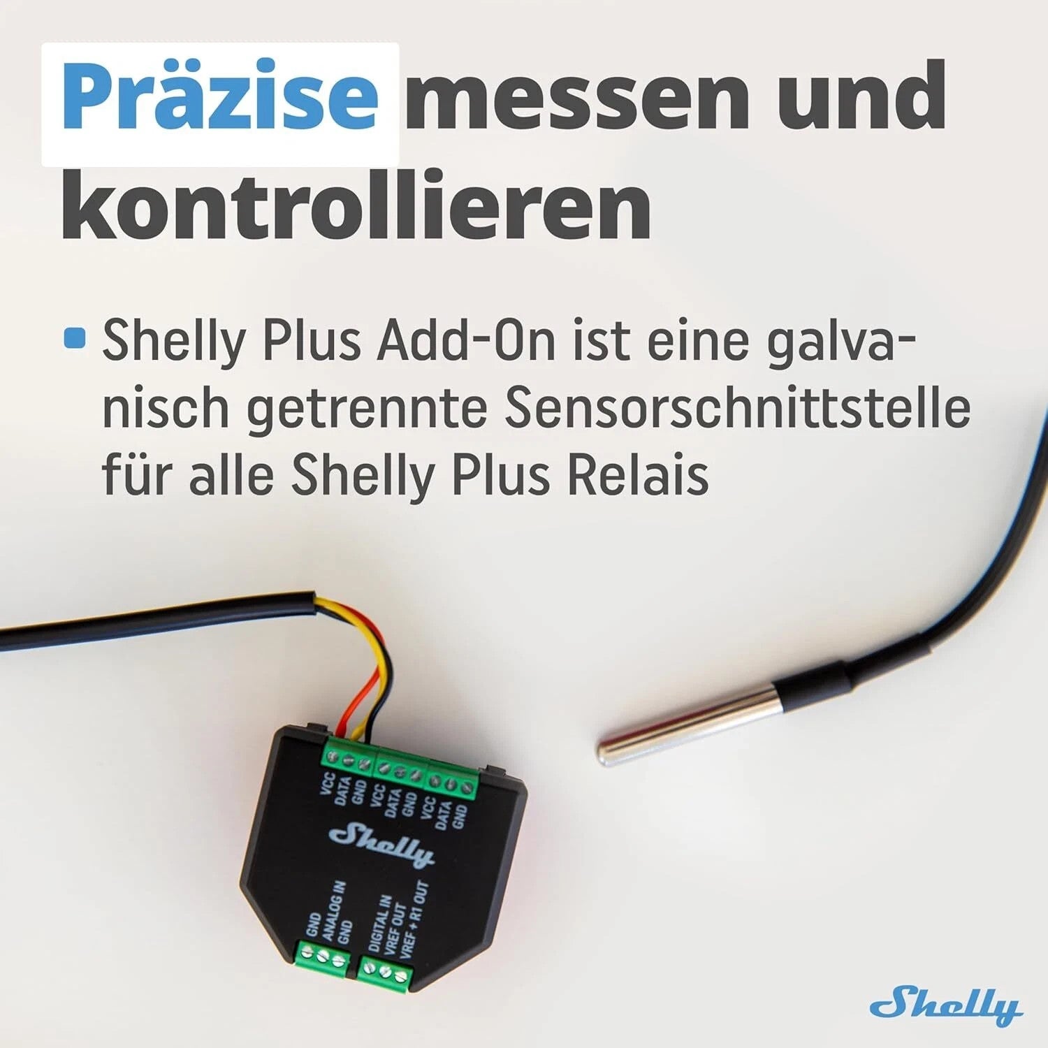 - Shelly Plus Add-On ist ein Wlan & Bluetooth Gadget für alle Shelly Plus Geräte, kann mit bis zu fünf DS18B20 (Temperatur) Sensoren oder einem DHT22 (Luftfeuchtigkeit) Sensor verwendet werden, das Gerät hat einen analogen und einen digitalen Eingang und ist mit den meisten Arduino Sensoren kompatibel.