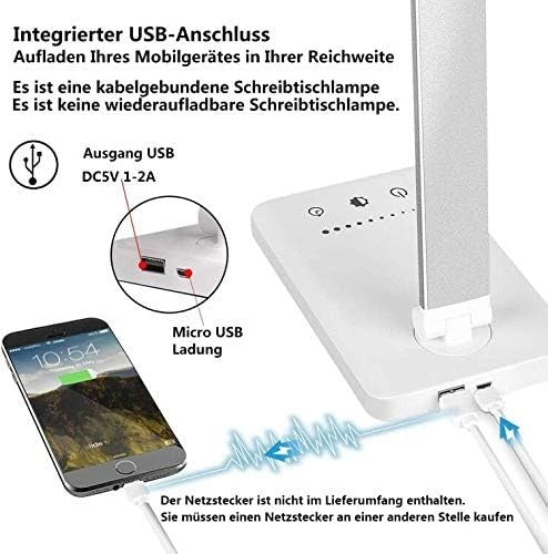 SLATOR Schreibtischlampe LED Dimmbare Tischleuchte 5 Farb und 10 Helligkeitsstufen Nachttischlampe USB-Anschluss für Aufladung des Smartphones Leselicht für Leser, Kinder, QM019, Aluminium, Silver