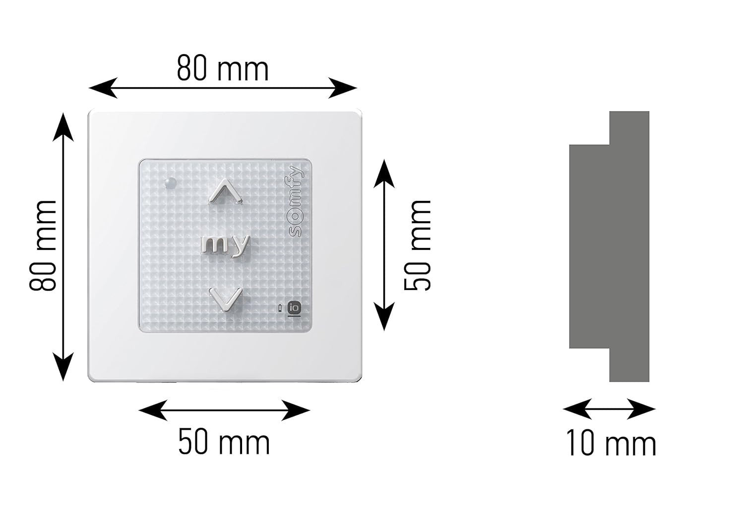 Die vorteile: betrieb über tasten. Passend für alle standardschalterbereiche über einen 50 mm x 50 mm adapterrahmen des switch -herstellers sowie eine montageplatte für andere schalterbereiche. Breite auswahl an designoptionen mit dem somfy smoove -rahmen. Gruppen- oder individueller betrieb möglich. Auf taste zum öffnen von roller jalousien rufen sie markisen zurück. Mein knopf zum stoppen oder erinnerung an die lieblingsposition. Off -taste zum schließen von rollenjalousien und den markisen verlängern. Programmiertaste auf der rückseite des moduls. Montageplatte für eine einfache und flexible wandmontage, keine flush -montage -box erforderlich led für die senderanzeige drahtlose und batteriebetriebene, minimale installationsaufwand mit batteriestatusanzeige.