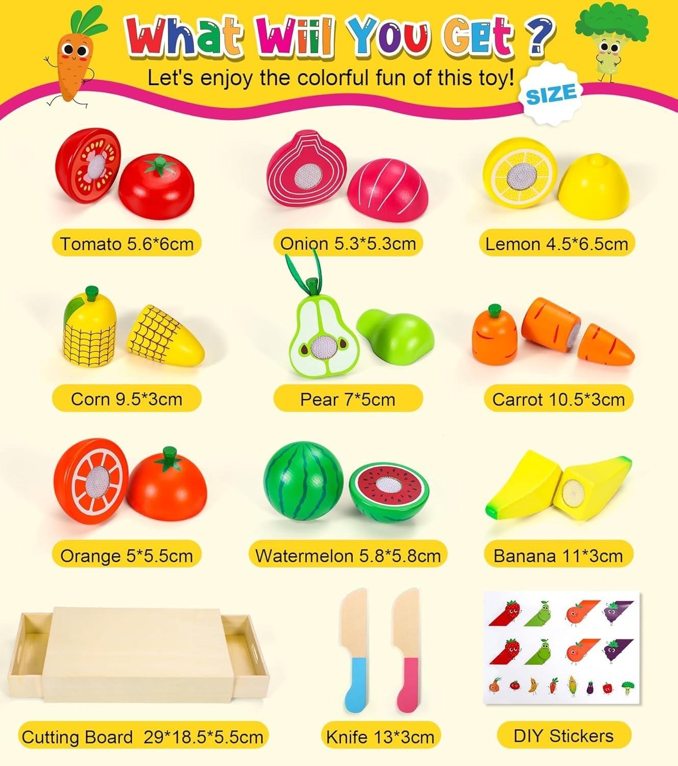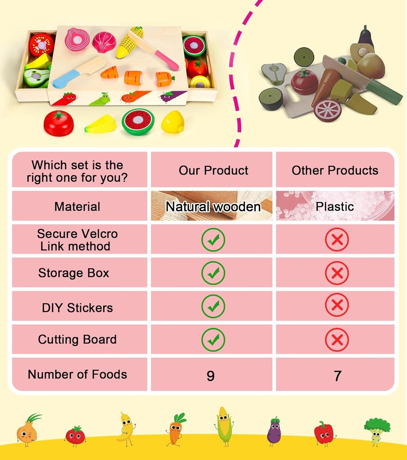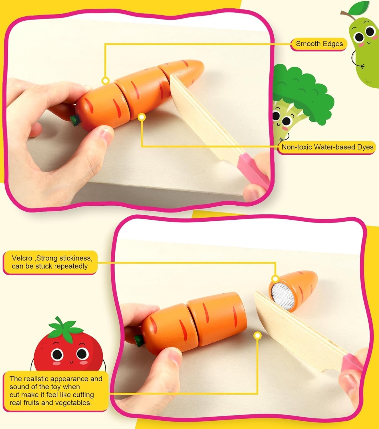 Hochwertige Kinderküche Zubehör Holz | Spielküche Zubehör mit Klettverschluss | Obst & Gemüse zum Schneiden | Montessori Lernspielzeug | Geschenk 2-4 Jahre