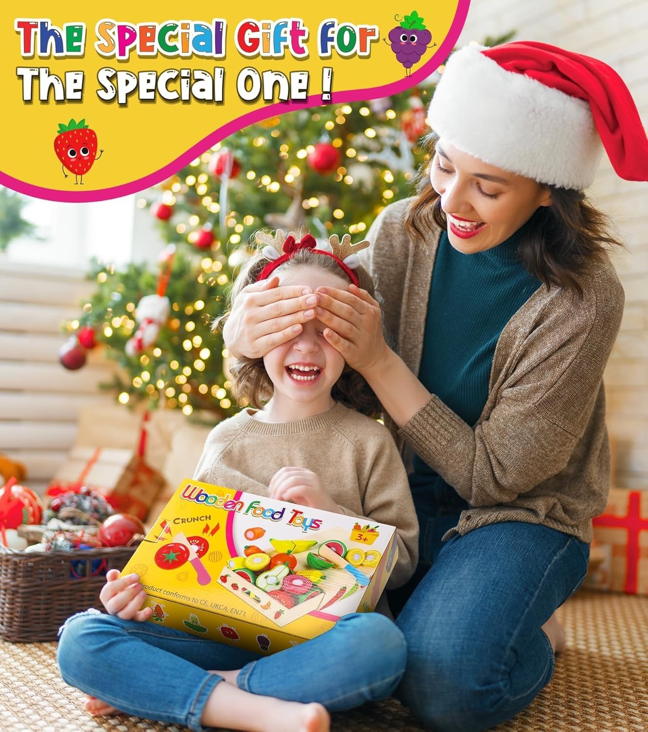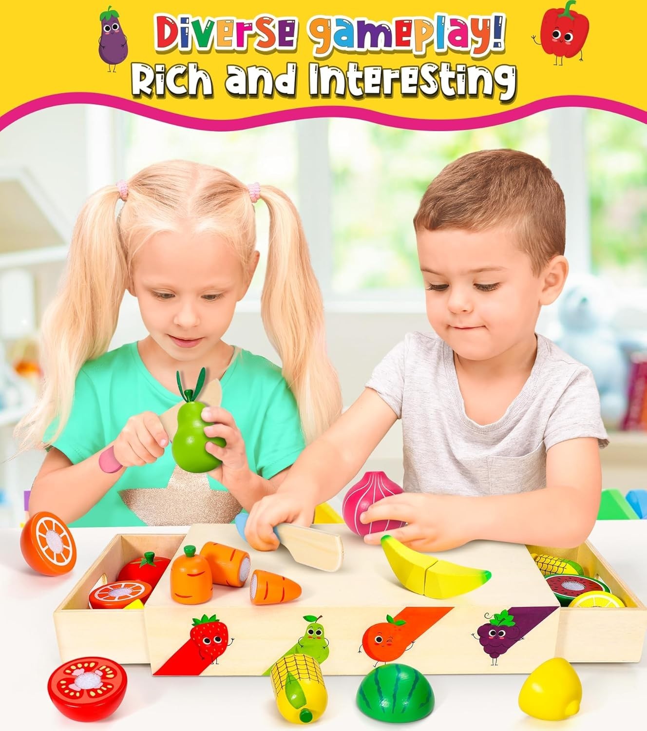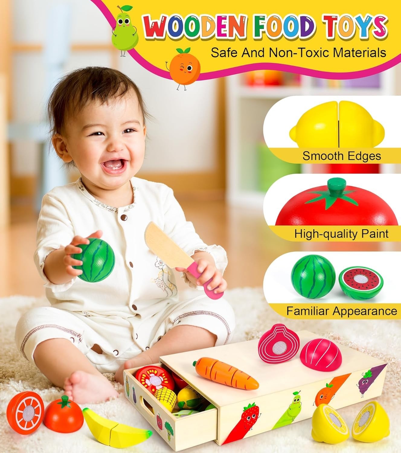 Hochwertige Kinderküche Zubehör Holz | Spielküche Zubehör mit Klettverschluss | Obst & Gemüse zum Schneiden | Montessori Lernspielzeug | Geschenk 2-4 Jahre