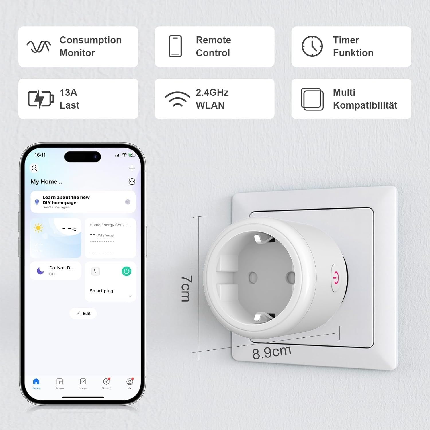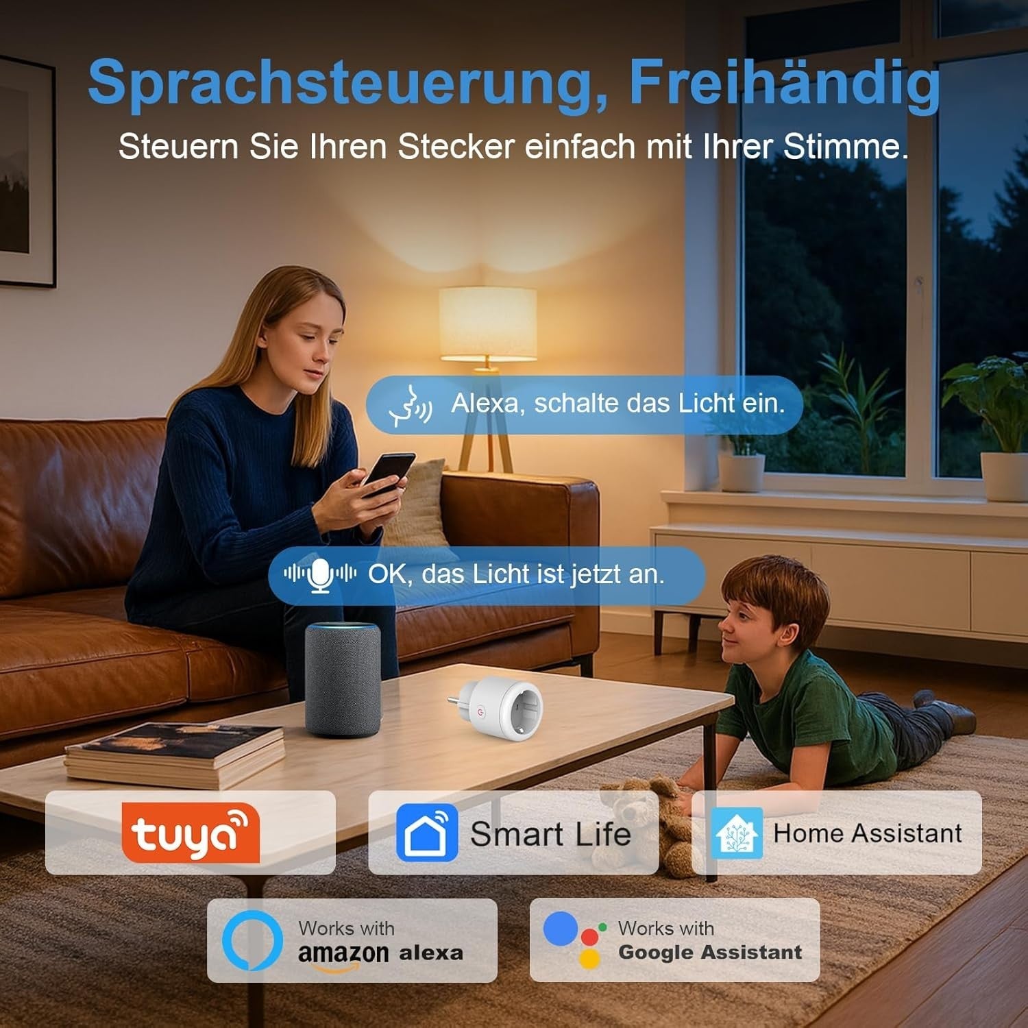 • 【Sprachsteuerung】Die smarte Steckdose funktioniert mit Amazon Alexa, Google Assistant und SmartThings. Dadurch können Sie Geräte mit Sprachbefehlen ein- oder ausschalten und so eine schnellere und intuitivere Benutzererfahrung genießen.