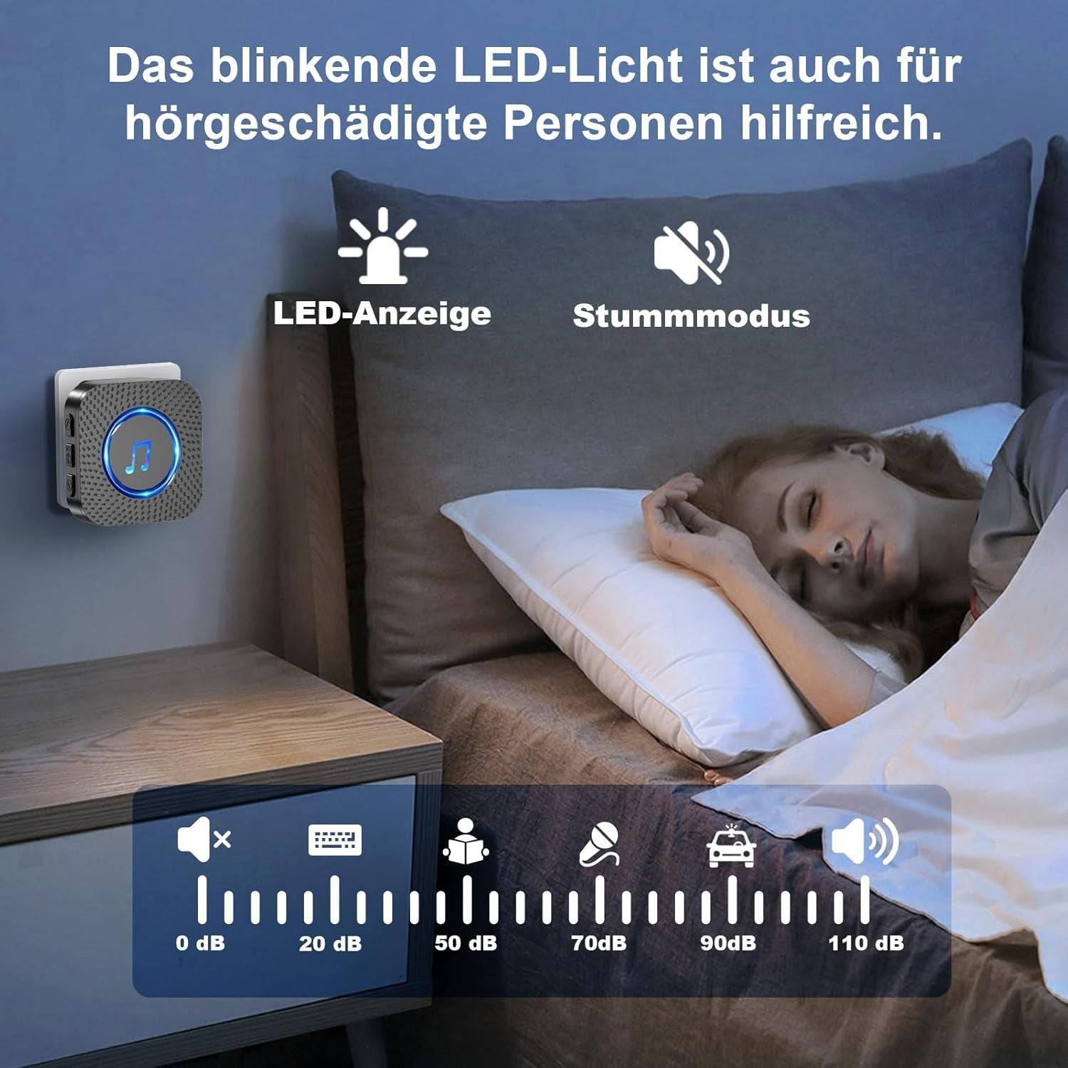 - 【Individueller Klang, Flexible Modi】Genießen Sie präzise Kontrolle mit 5 Lautstärkestufen bis zu 110 dB, ideal für Hörgeschädigte oder Senioren. Wechseln Sie einfach zwischen LED nur oder LED + Klingelmodus und wählen Sie aus 55 Melodien für individuelle Benachrichtigungen. Ihre letzten Einstellungen werden für ununterbrochene Bequemlichkeit gespeichert.
