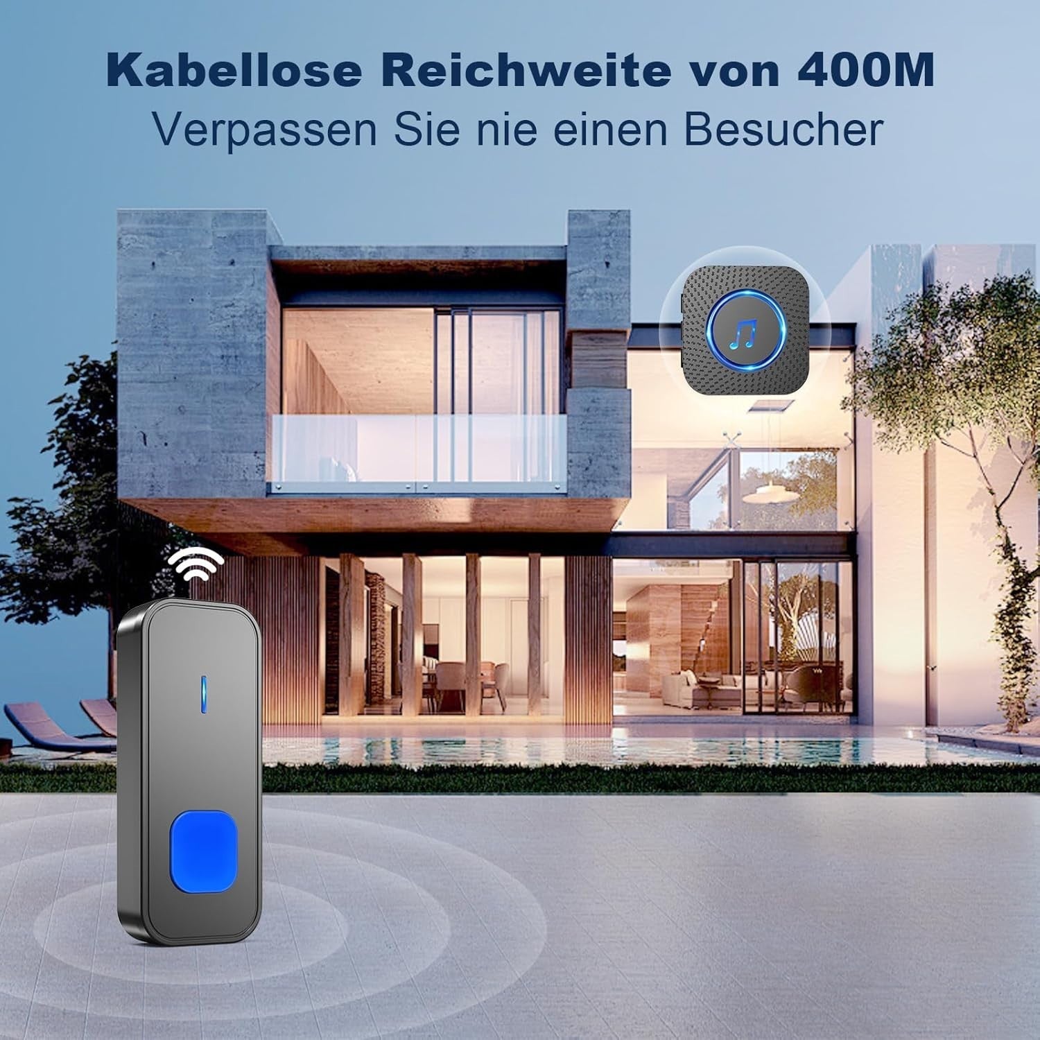 - 【Starker Empfang, Überall】Unsere Türklingel bietet eine leistungsstarke Reichweite von 400 Metern (ohne jegliche Abschirmung) in offenen Bereichen, damit Sie immer erreichbar sind. Egal, ob Sie im Garten, oben im Haus oder sogar im Keller sind, verpassen Sie nie wieder einen Besucher!