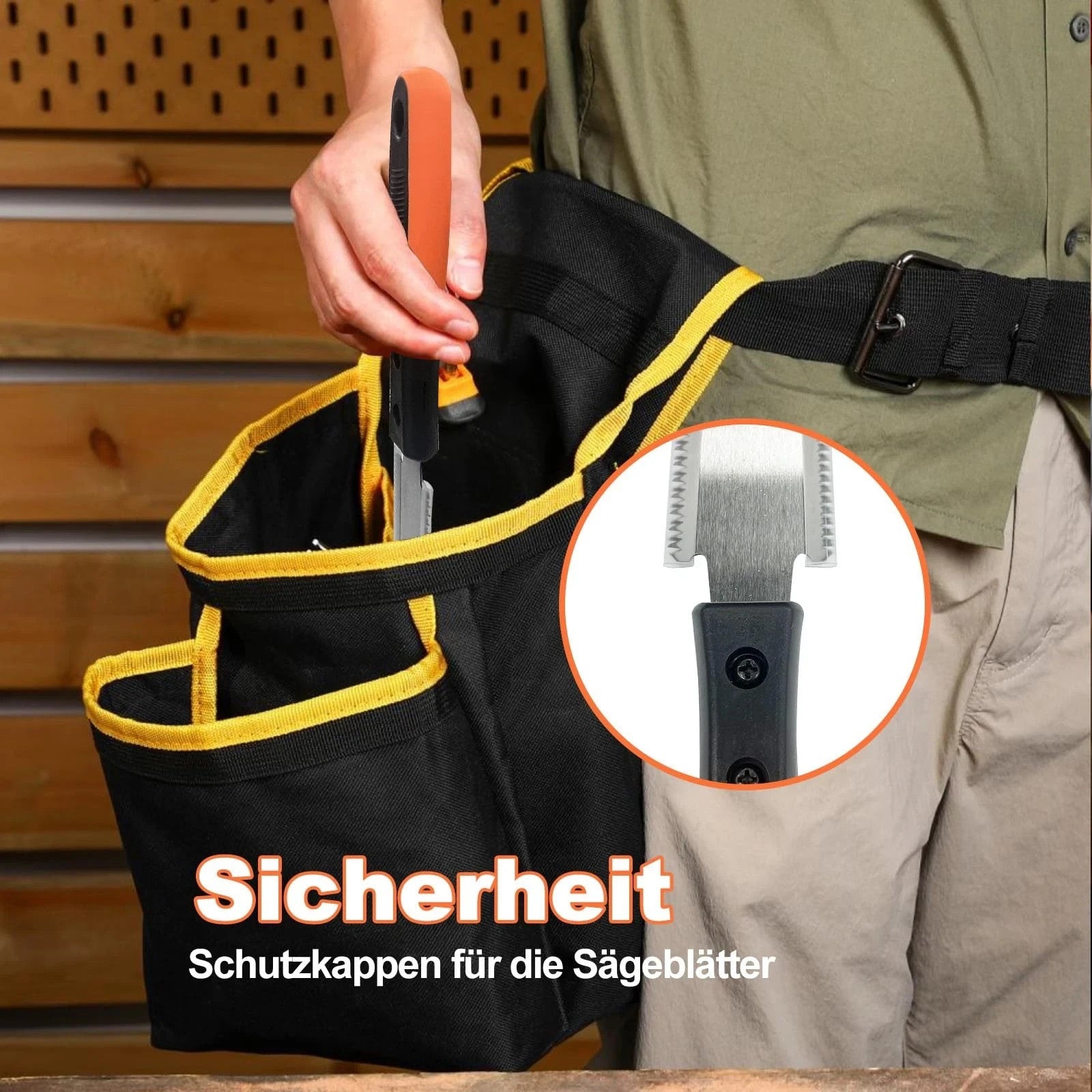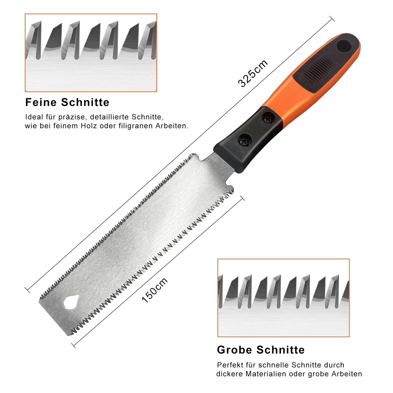 • Zweiseitiges Zahndesign: Eine Seite mit gröberen Zähnen eignet sich für schnelle Schnitte, während die andere Seite mit dichteren Zähnen für relativ feinere Schnitte konzipiert ist. Beide Seiten sind mit einer Schutzhülle versehen, die die Säge und den Benutzer bei Nichtgebrauch schützt.
