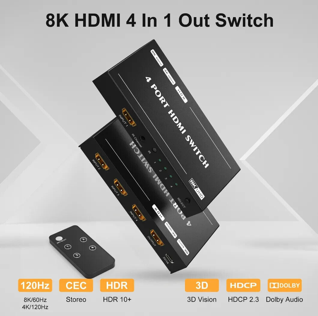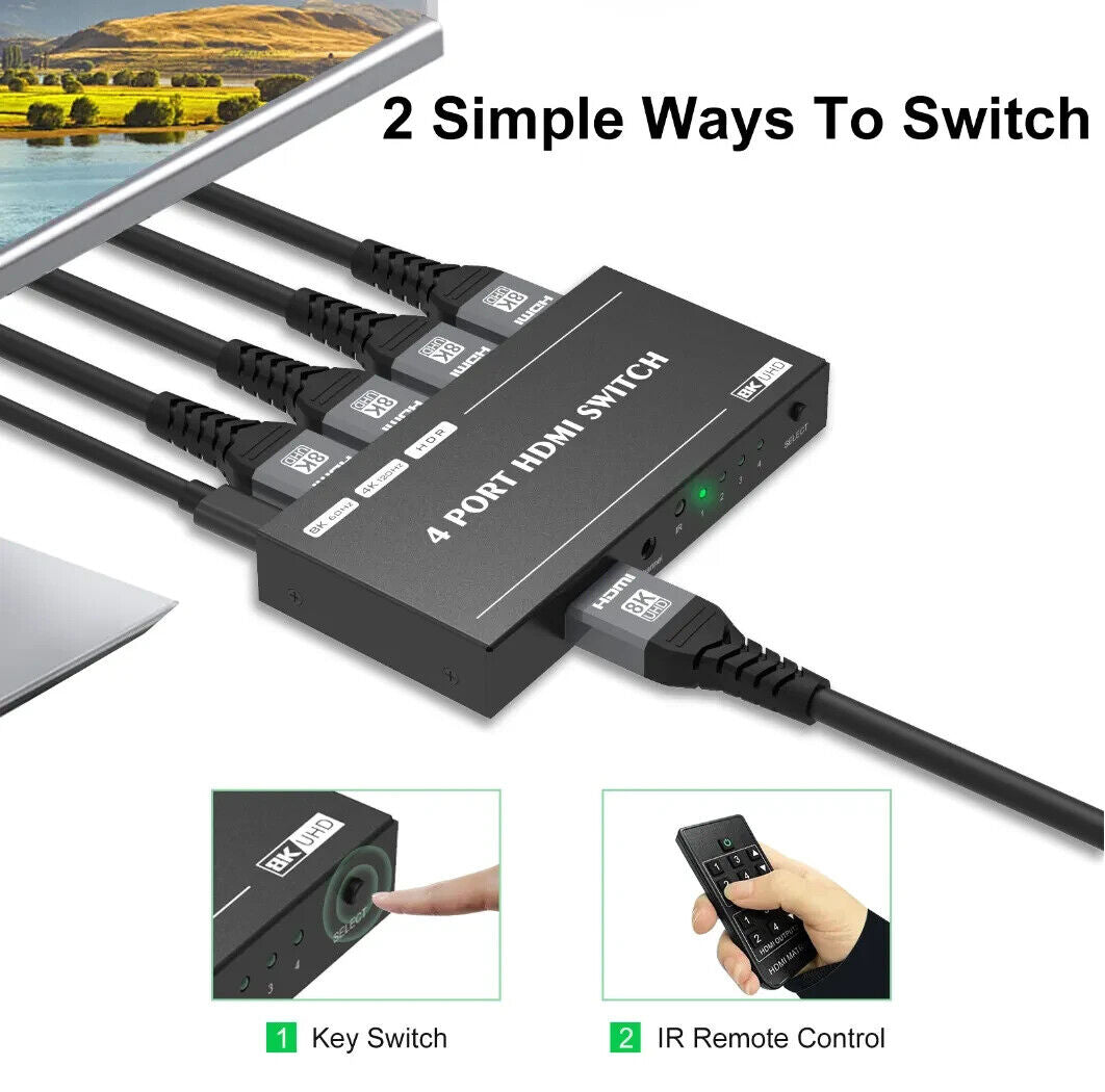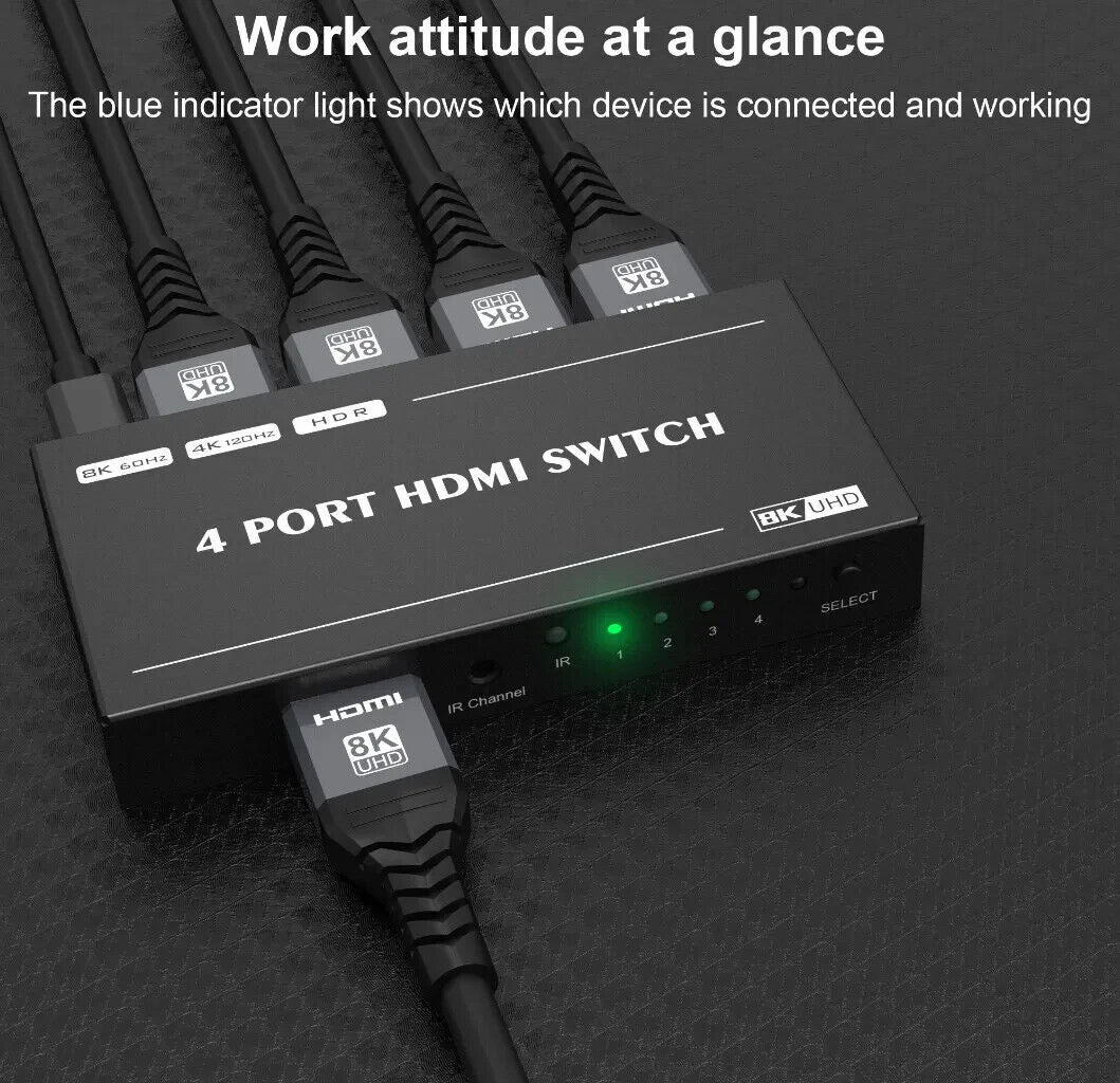 4K@144Hz HDMI Switch 4 in 1 Out 8K HDMI 2.1 Splitter HDR10 IR -Remote für PS5 PS4 Laptop Switch Projector TV