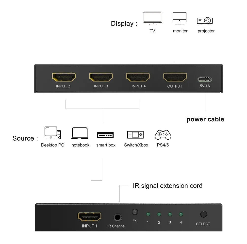 • Schließen Sie Ihre Geräte mühelos mit dem 4-Port-HDMI-Switch an, sodass ein nahtloses Umschalten zwischen mehreren Quellen ermöglicht.Genießen Sie die Bequemlichkeit, alle Ihre Geräte an einem Ort angeschlossen zu haben.