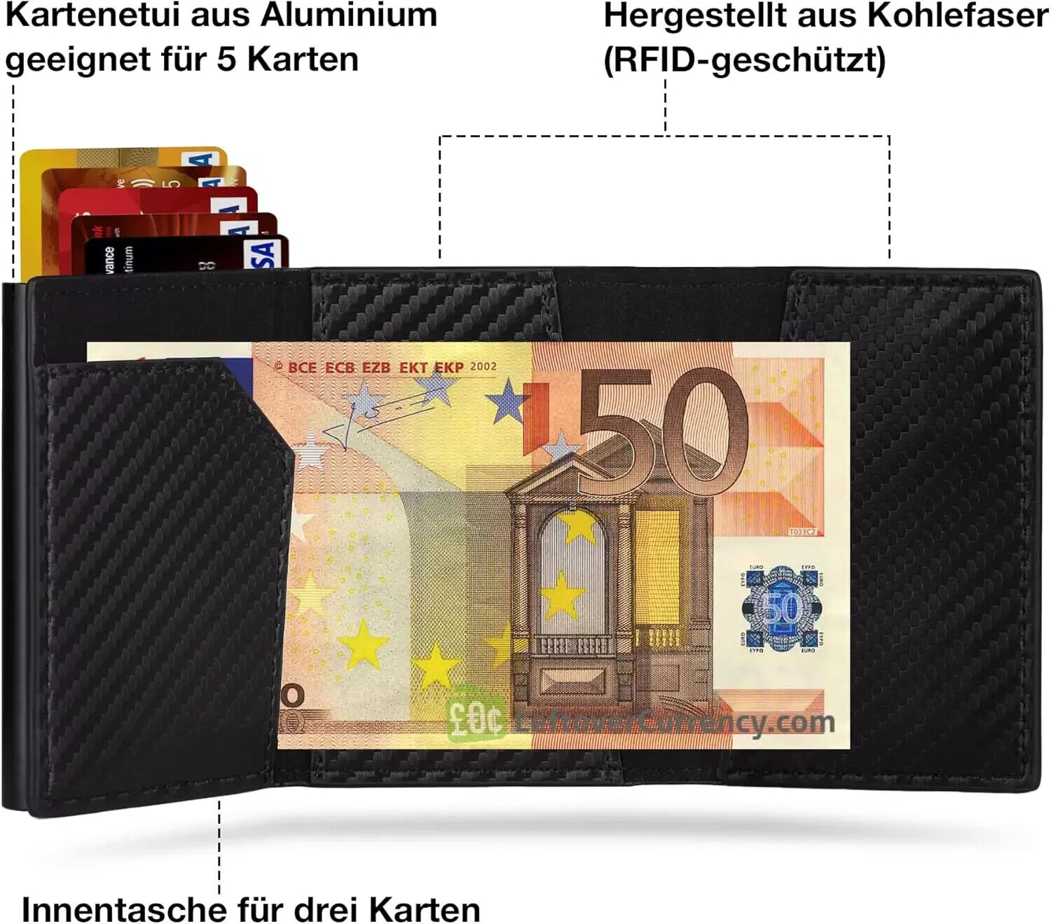 Die Brieftasche ist mit einer schnellen Ausziehfunktion für 5 Karten und einem neuen robusten Knopf ausgestattet.