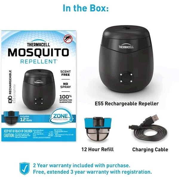 E-55 schwarz, Das wiederaufladbare Gerät ist unser fortschrittlichstes Abwehrsystem überhaupt und hält Mücken fern - ohne Spray. Innerhalb weniger Minuten erhitzt und aktiviert das System unser geruchsfreies, unsichtbares Abwehrmittel und schützt den Außenbereich vor Mücken. Die wiederaufladbare und langlebige E-Serie ist unglaublich effektiv und umweltfreundlich.