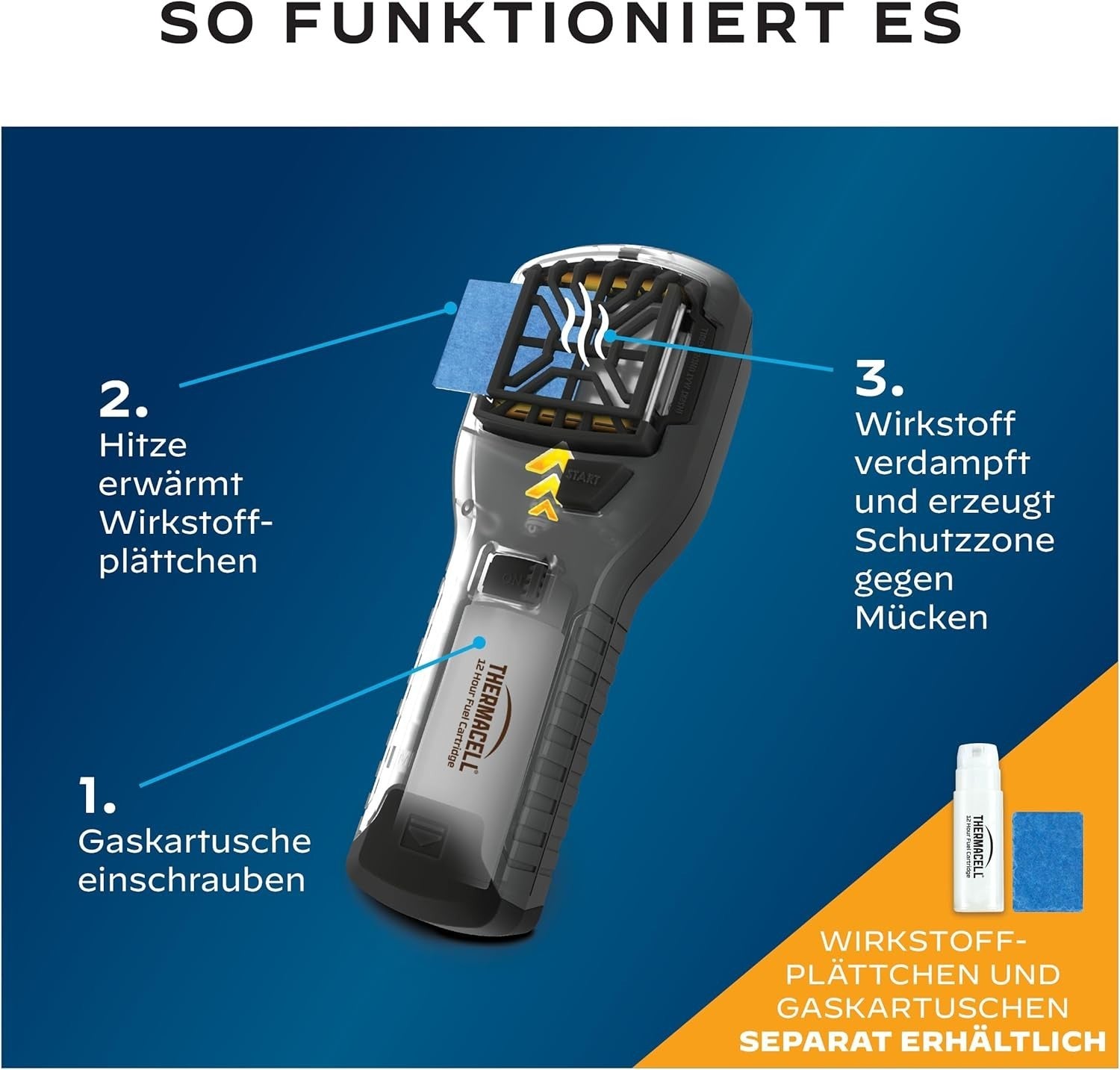 - Thermacell wirkt geruch- und lautlos sowie schnell und stundenlang gleichbleibend zuverlässig. Thermacell wirkt in Minuten und schützt für Stunden. Die Gaskartusche erhitzt das Wirkstoffplättchen und in wenigen Minuten baut sich die Schutzzone gegen Mücken auf, in die Mücken nicht eindringen können.