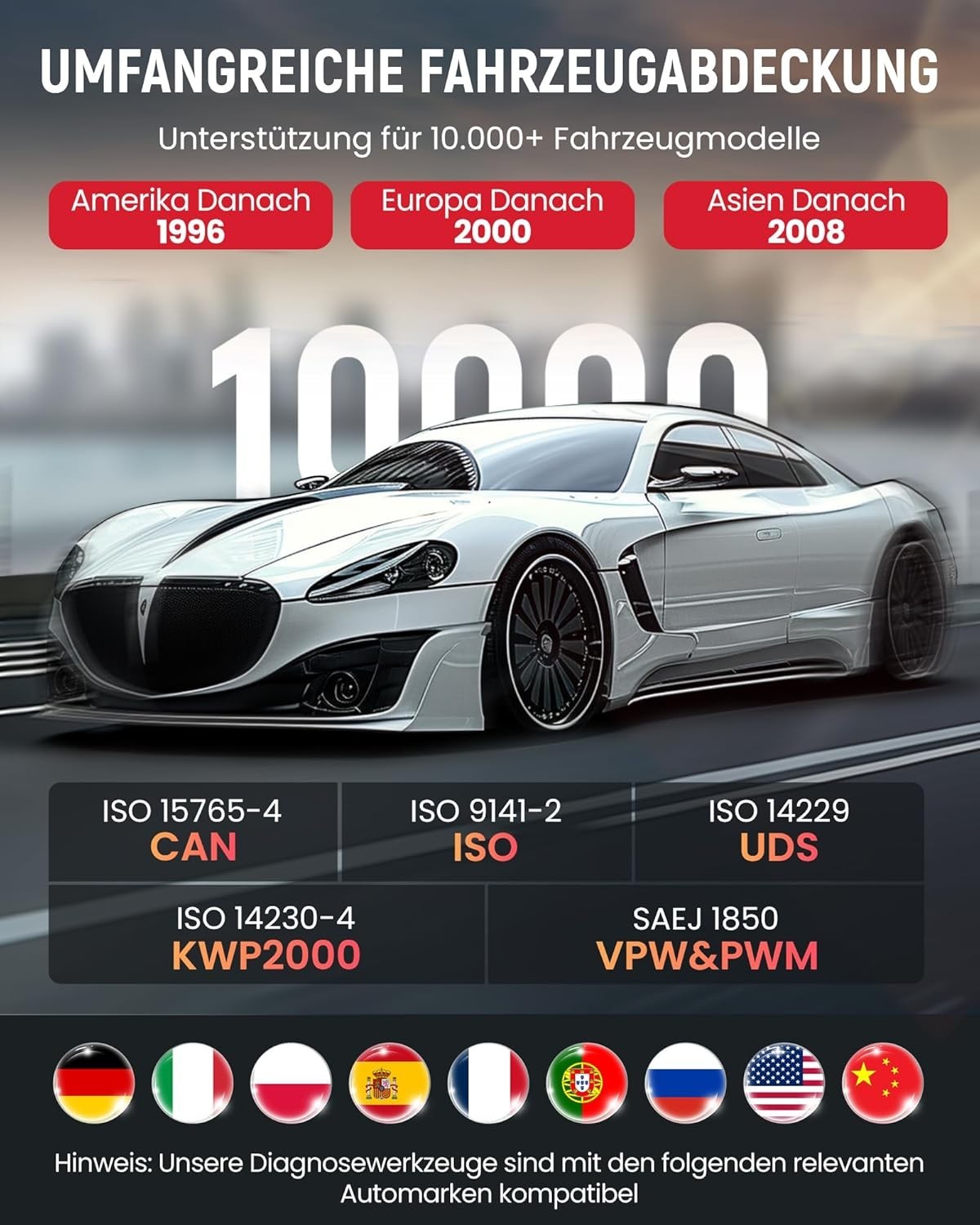 • 【Breite Fahrzeugabdeckung】- THINKCAR Auto Auslesegerät, kompatibel mit den meisten US-Autos ab Baujahr 1996, EU-Autos ab 2000, sowie in nach 2008 Asien hergestellten Fahrzeugen, unterstützt bis zu 8 Fahrzeugsprachen: Deutsch, Englisch, Französisch, Spanisch, Russisch, Italienisch, Polnisch und Portugiesisch. Es unterstützt alle OBDII-Protokolle ISO 14230-4(KWP2000), ISO 15765-4(CAN), ISO9141-2(ISO), ISO14229(UDS), SAEJ1850(VPW&PWM).