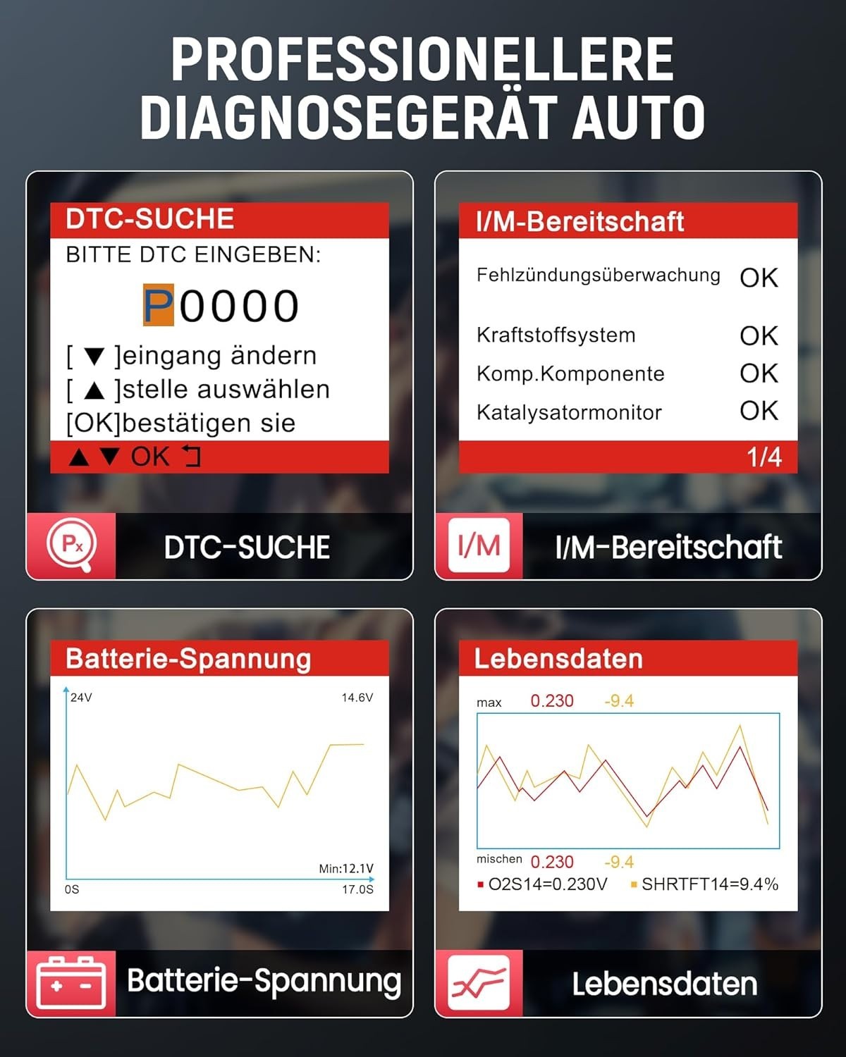 • 【Erweitertes OBD2-Diagnosetool】- Dieses auto diagnosegerät macht es einfach, die Ursache für eine Motorstörung zu ermitteln, schnell lesen und löscht diagnostische Fehlercodes. Unterstützt Multifunktionen: Codes lesen/löschen, 1/M Bereitschaft, Live-Datenstrom Lesen, EVAP-Systemtest, On-Board-Mintor-Test, O2-Sensortest, Liest Freeze Frame Daten, Fehlercode-Suche, Fahrzeuginformationen Lesen, Lastwert berechnen, Motorkühlmitteltemperatur abrufen, Motordrehzahl abrufen.
