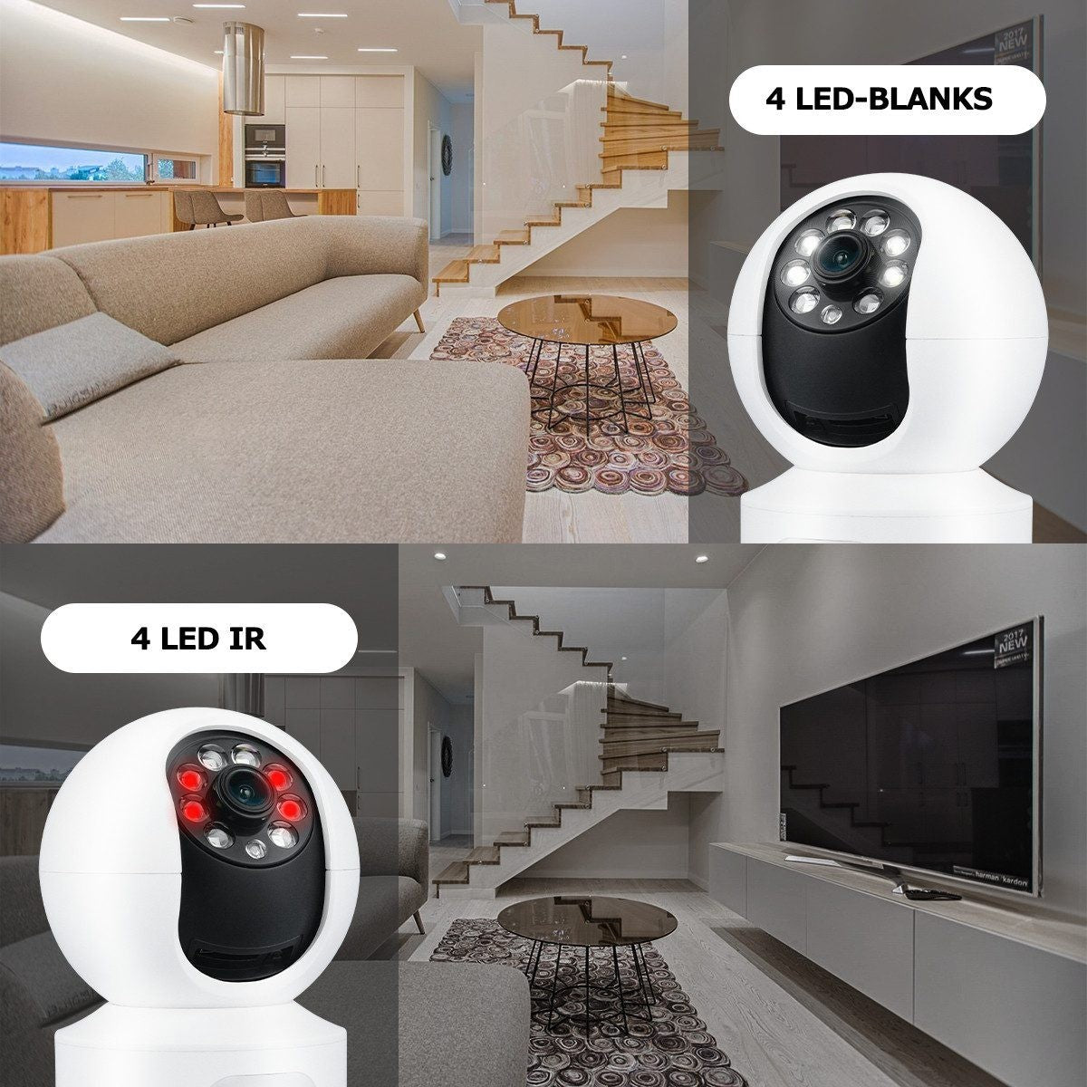• Die Überwachungskamera Innen hat 2 Kameras. Sie können die obere Überwachungskamera Rotation aus der Ferne zu steuern; die untere ist feststehende Kamera (nicht Batterie-Kamera).