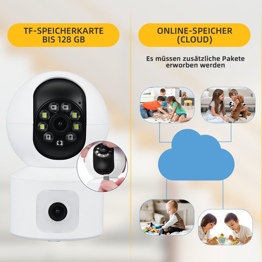 • Die Überwachungskamera Innen für die Haussicherheit unterstützt Mikro-SD-Karten (bis zu 128 GB, nicht im Lieferumfang enthalten) und Cloud-Speicher , die Videoaufzeichnung