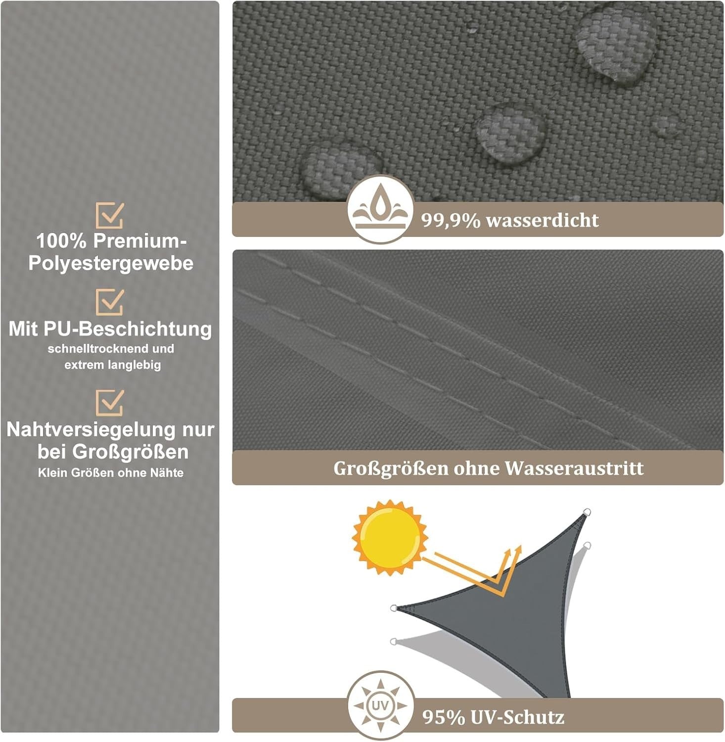 - 【99% Wasserdichtigkeit】Das Sonnensegel ist mit einer wasserdichten PU-Beschichtung ausgestattet. Die Nähte wurden heiß versiegelt, um Undichtigkeiten zu vermeiden. Es hält einem Wasserdruck von über 400 kPa stand.