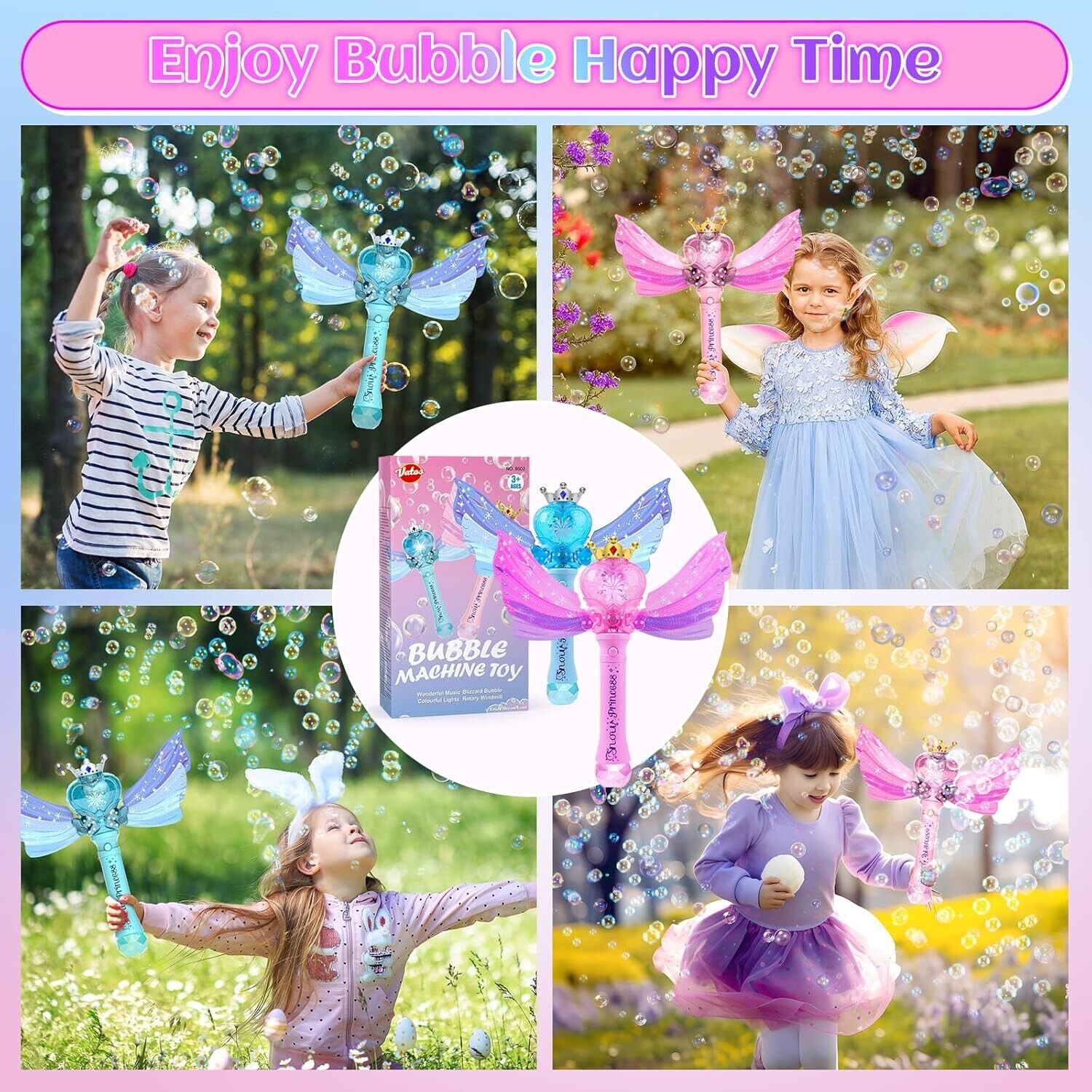 - 2 Pack Princess Bubble Wand - Dieses Seifenblasenmaschinen-Set enthält 2 automatische Seifenblasenstäbe, rosa und blaue Flügel, 1 Schraubenzieher, 4 Flaschen Seifenblasenlösungen. Mit leuchtenden Farben und einem schönen fariy Prinzessin Design, ist diese Seifenblasenmaschine Set perfekt für Mädchen und macht eine große Outdoor-Spielzeug für Kinder.