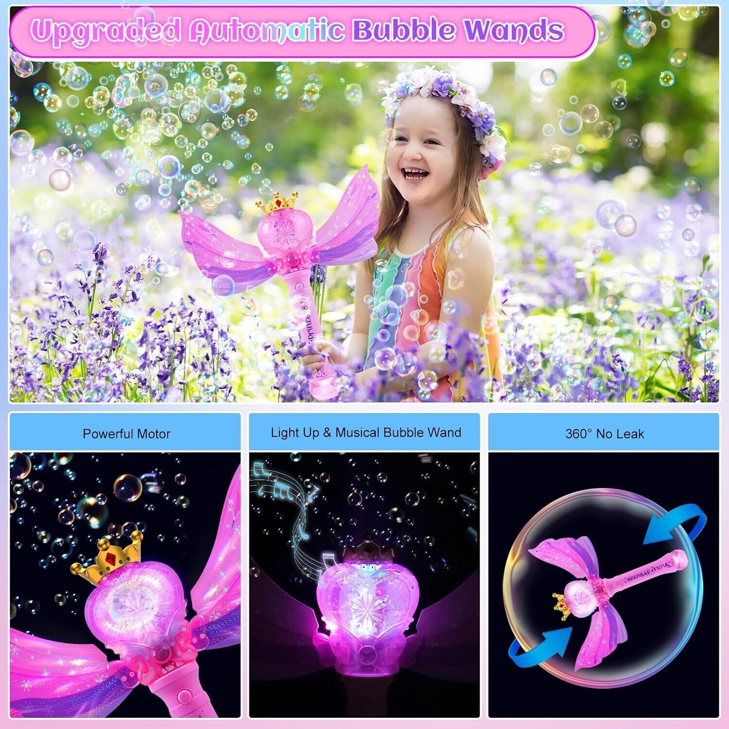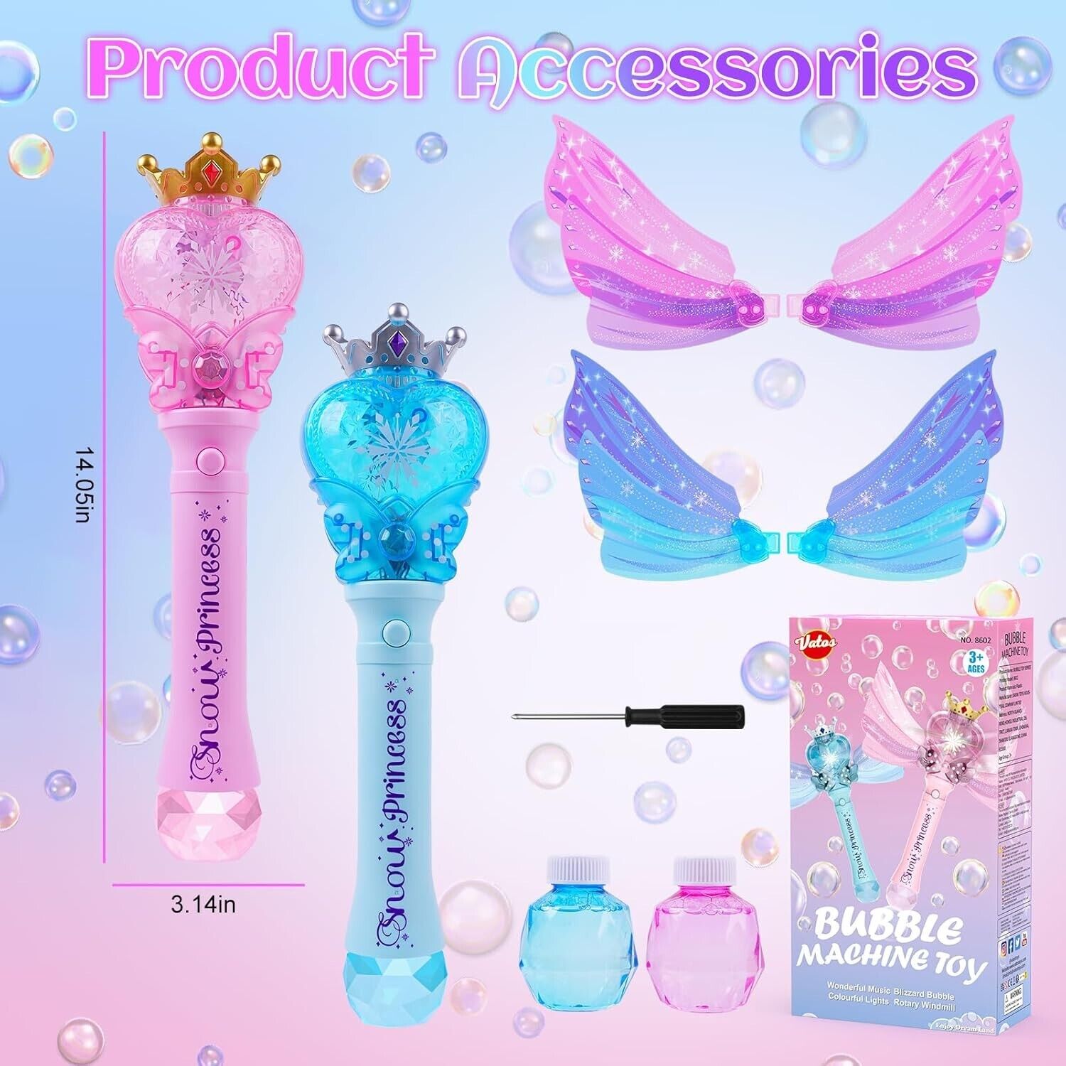 - 2 Pack Princess Bubble Wand - Dieses Seifenblasenmaschinen-Set enthält 2 automatische Seifenblasenstäbe, rosa und blaue Flügel, 1 Schraubenzieher, 4 Flaschen Seifenblasenlösungen. Mit leuchtenden Farben und einem schönen fariy Prinzessin Design, ist diese Seifenblasenmaschine Set perfekt für Mädchen und macht eine große Outdoor-Spielzeug für Kinder.